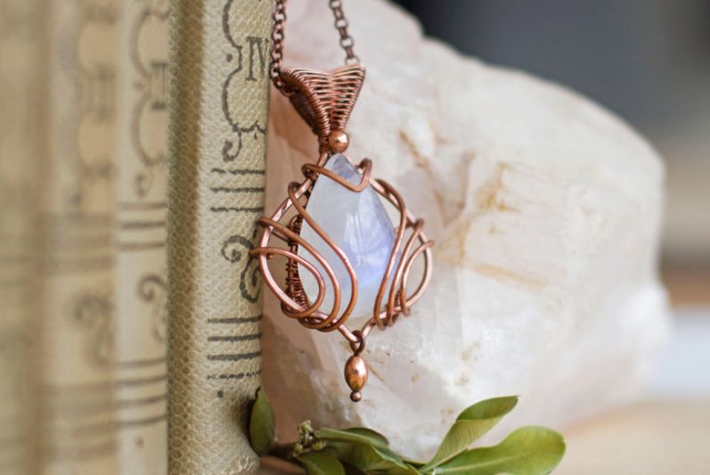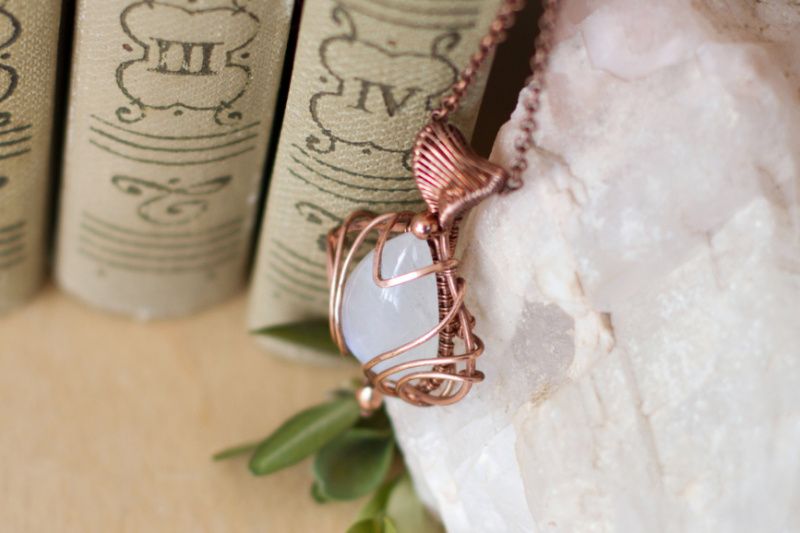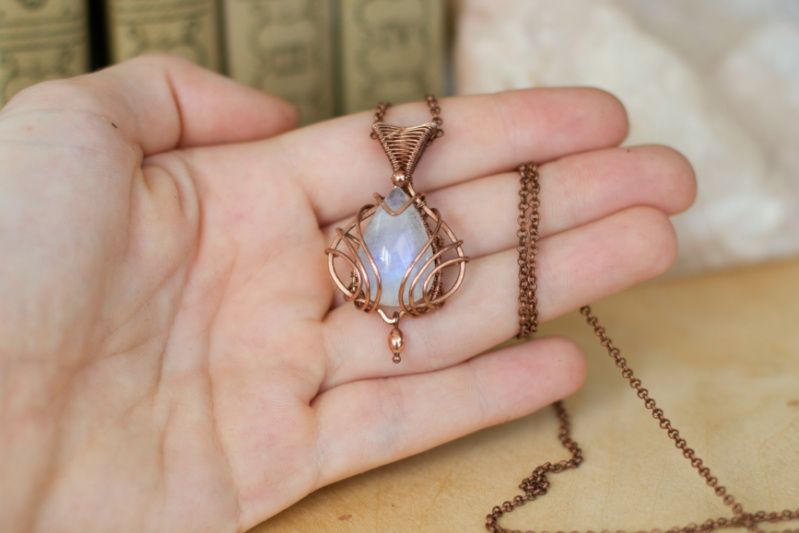 Виготовлено з міді у техніці wire wrap та місячного каменя.