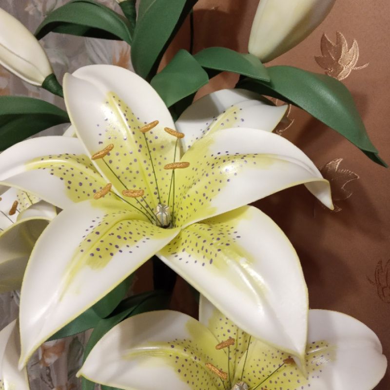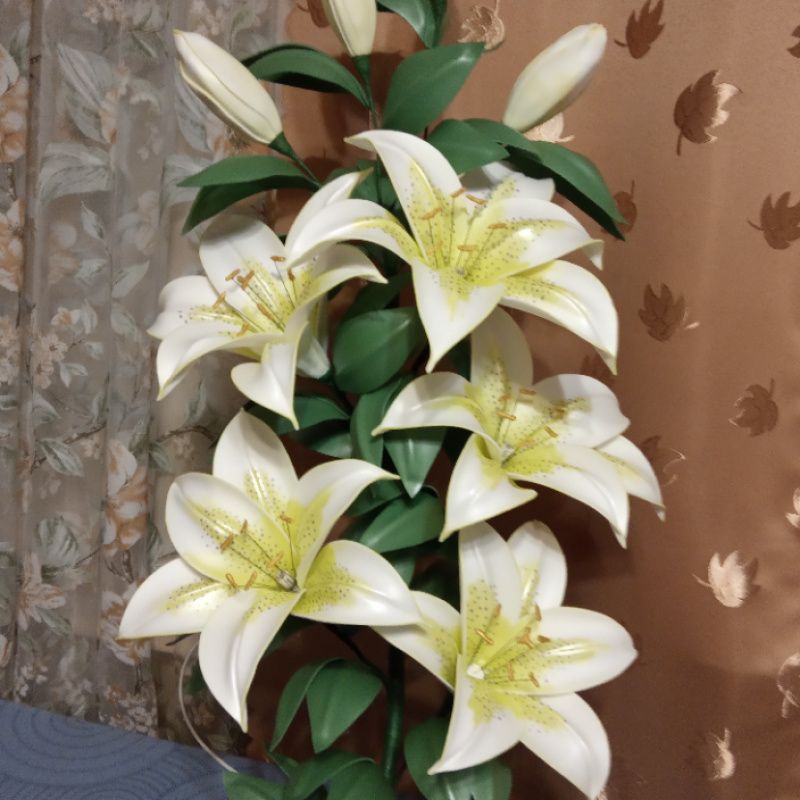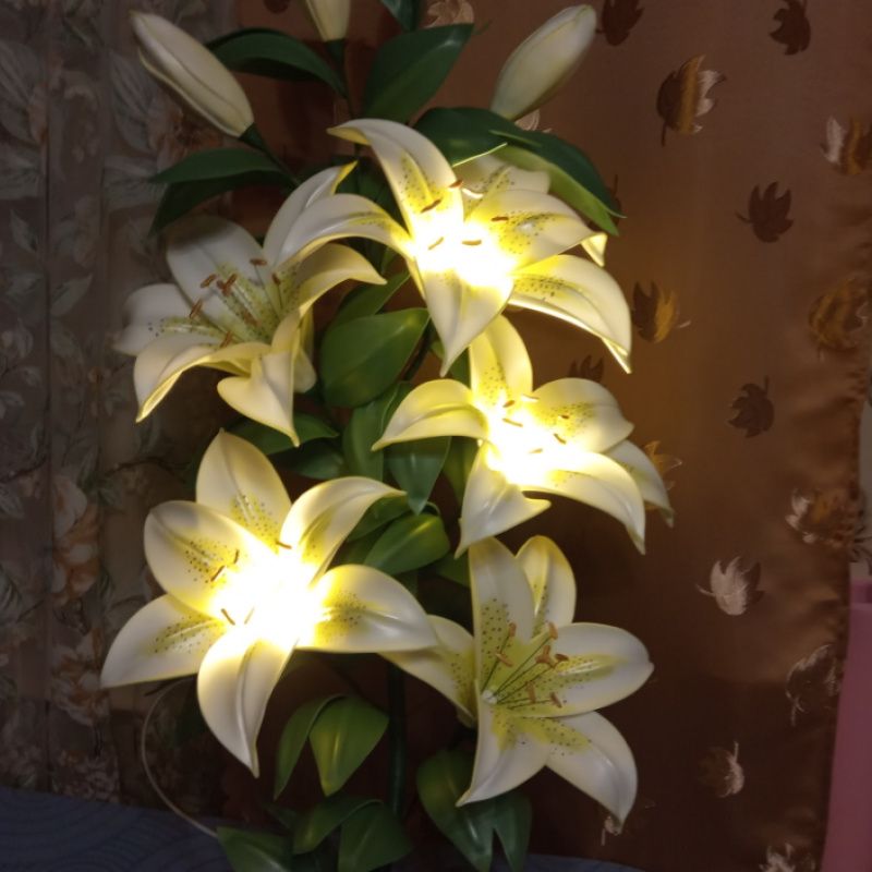 Лілія- світильник ручної роботи. Складається із 5 квітів. Діаметр-27 см. Три лілії світяться. Також є 4 бутони. Колір - білий. Серединка- лаймова із фіолетовими крапочками . Зроблені з матеріалу - ізолон. Висота вироба- 104 см. Ширина - 54 см.
