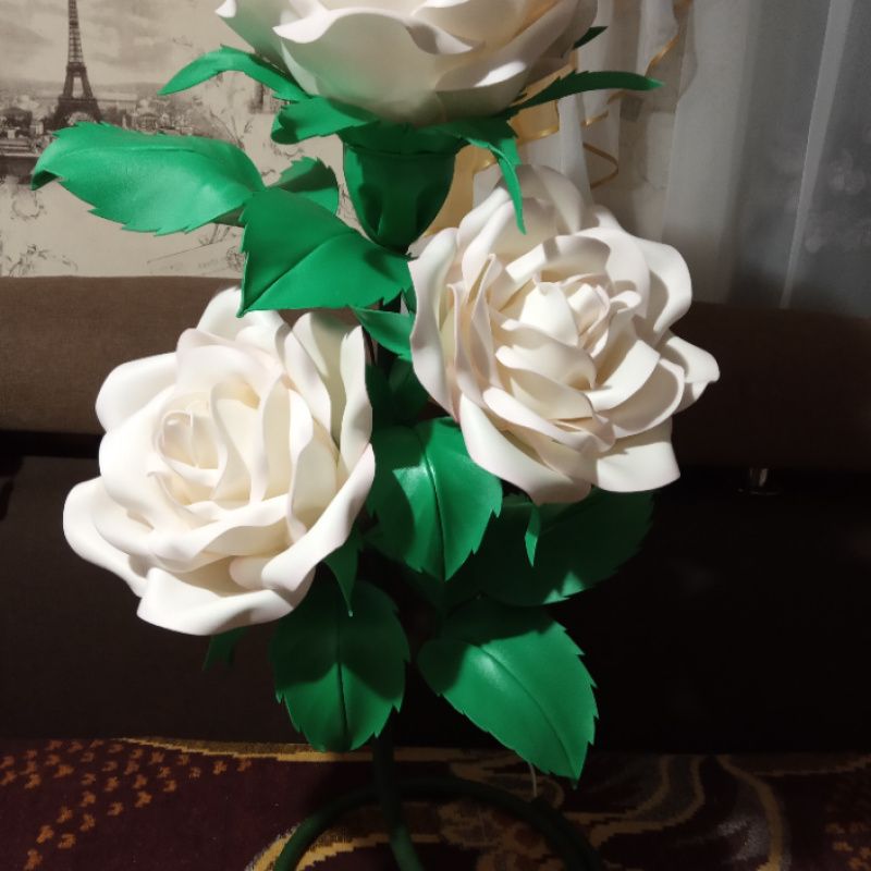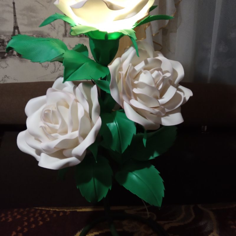 Троянда- світильник ручної роботи. Складається із 3 троянд. Діаметр квітів-35см, 28 см, 28 см. Одна троянда всередині має світодіодні підсвітку. Висота виробу-100 см. Колір- білий із блідо- рожевими краями.