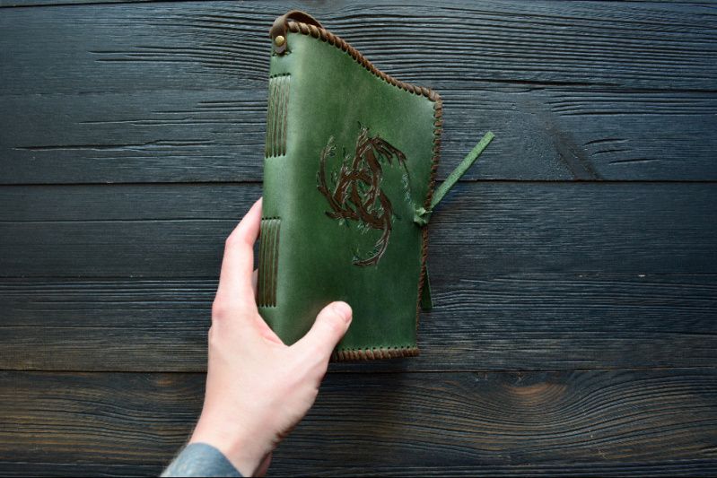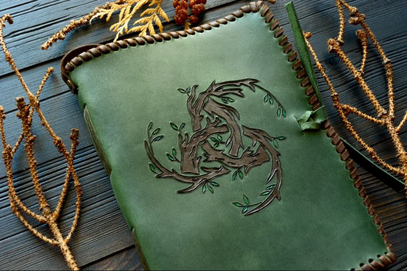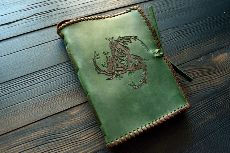 Блокнот виконано з зеленої шкіри сrazy horse насиченого зеленого кольору, особливість якої – поступове зістарення від експлуатації та надання речам особливого неповторного шарму. Зображення на блокноті вкрито фінішною захисною обробкою, що подовжує та покращує життя малюнку під час використання блокноту.