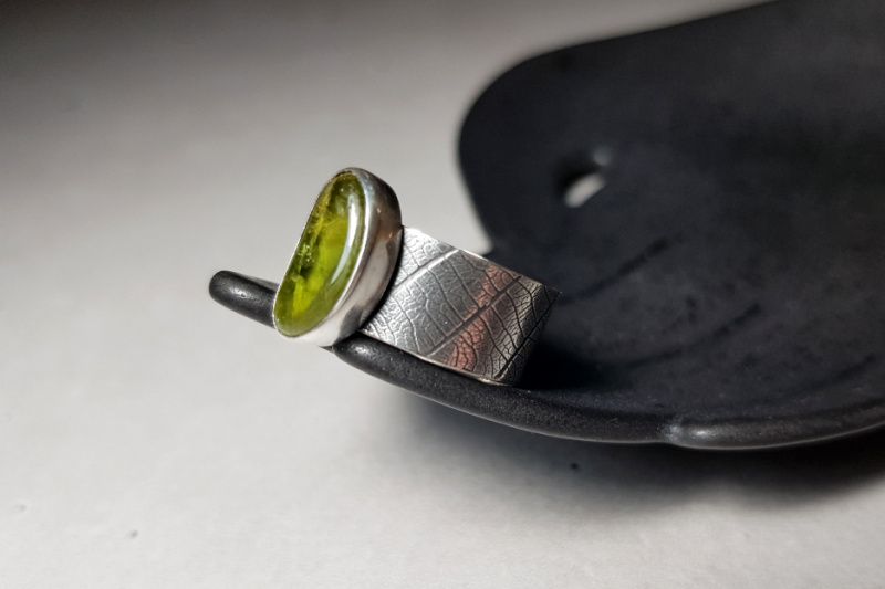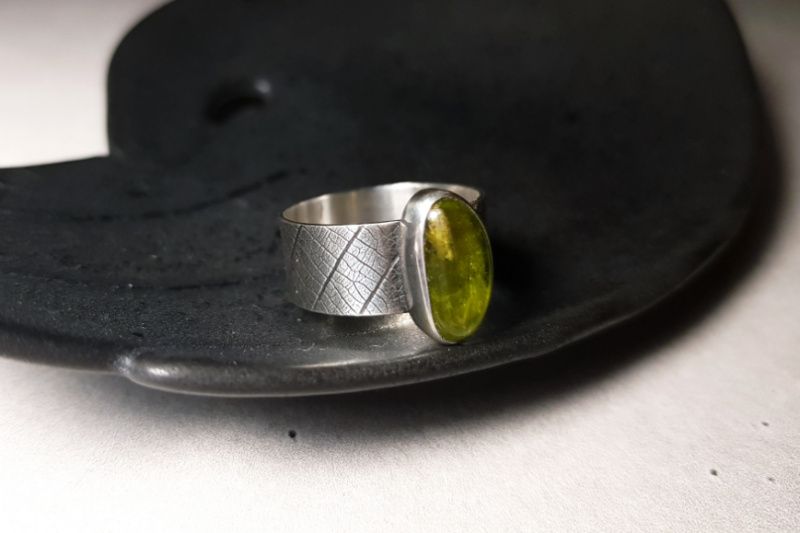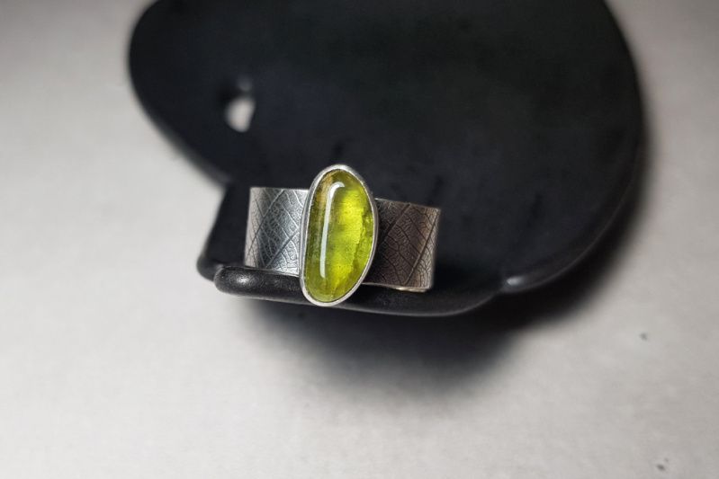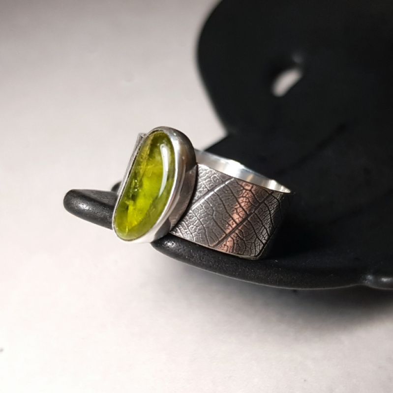 Каблучка виготовлена повністю вручну (шляхом випилювання, пайки, текстурування) зі срібла 925 проби (шинка та дно), чистого срібла 999 проби (ободок навколо каменя) та натурального хризоліта.