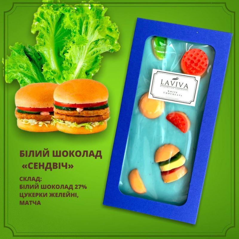 Унікальний органічний шоколад ручної роботи. Авторський рецепт білого шоколаду ручної роботи з натуральними спеціями: голуба матча, сублімований лимон і пудра манго всередині та декоровано желейними цукерками Сендвіч на поверхні, таке поєднання створює неперевершене враження та смакує по особливому. Ідеальний шоколад можливий тільки із ідеального бельгійськоко шоколаду Callebaut, що є основою Laviva. ✔ 100% Натуральні інгредієнти ✔ Без ГМО та хімії ✔ Без транс-жирів та консервантів ✔ Зроблено в Україні ✔ Ручна робота ✔ Унікальна рецептура Вага: 100 ± 5г Термін придатності один рік з моменту виготовлення. Зберігати в прохолодному і сухому місці при температурі 18-22С. Шоколад є чудовим подарунком на День народження, до Дня закоханих, 8 Березня та у якості корпоративного подарунку.