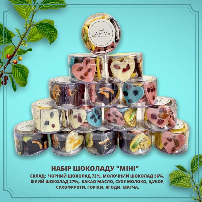 Тубусик із органічним шоколадом ассорті, тут є все, щоб спробувати всі смаки Laviva одночасно, білий (кольоровий) органічний шоколад, що пофарбовано натуральними барвниками, а також чорний та молочний шоколад. Всі міні шоколадки декоровані вручну та абсолютно унікальні. Для декорування використовуються сухобрукти, горіхи, ягоди та насіння. Ідеальний шоколад можливий тільки із ідеального бельгійськоко шоколаду Callebaut, що є основою Laviva. ✔ 100% Натуральні інгредієнти ✔ Без ГМО та хімії ✔ Без транс-жирів та консервантів ✔ Зроблено в Україні ✔ Ручна робота ✔ Унікальна рецептура Вага: 45г. Термін придатності один рік з моменту виготовлення. Зберігати в прохолодному і сухому місці при температурі 18-22С. Шоколад є чудовим подарунком на День народження, до Дня закоханих, 8 Березня та у якості корпоративного подарунку.
