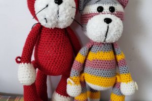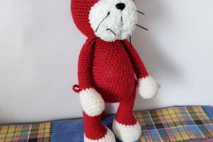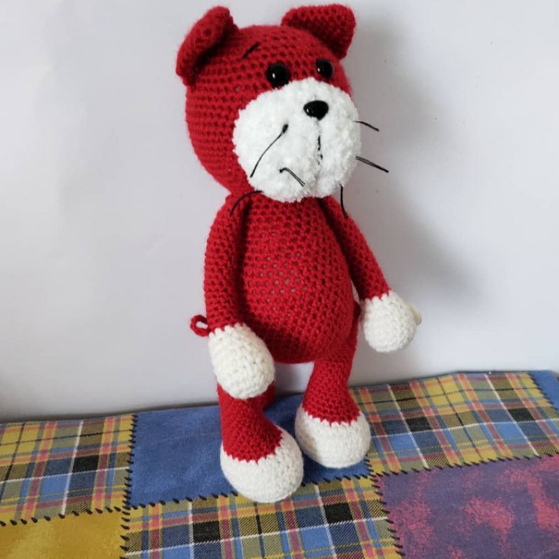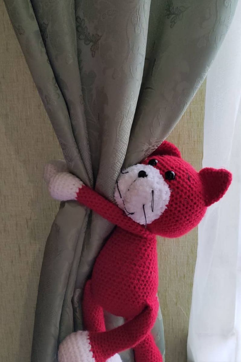 Котик в'язаний гачком з акрилової пряжі. Наповнювач холлофайбер. Іграшка і підхоплення для штор. На одній лапці застібка ґудзик, на другий-петелька. Колір червоний, можливе виготовлення в інших кольорах.