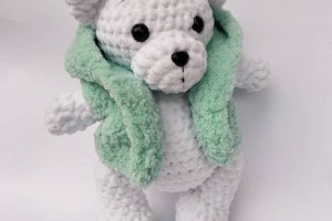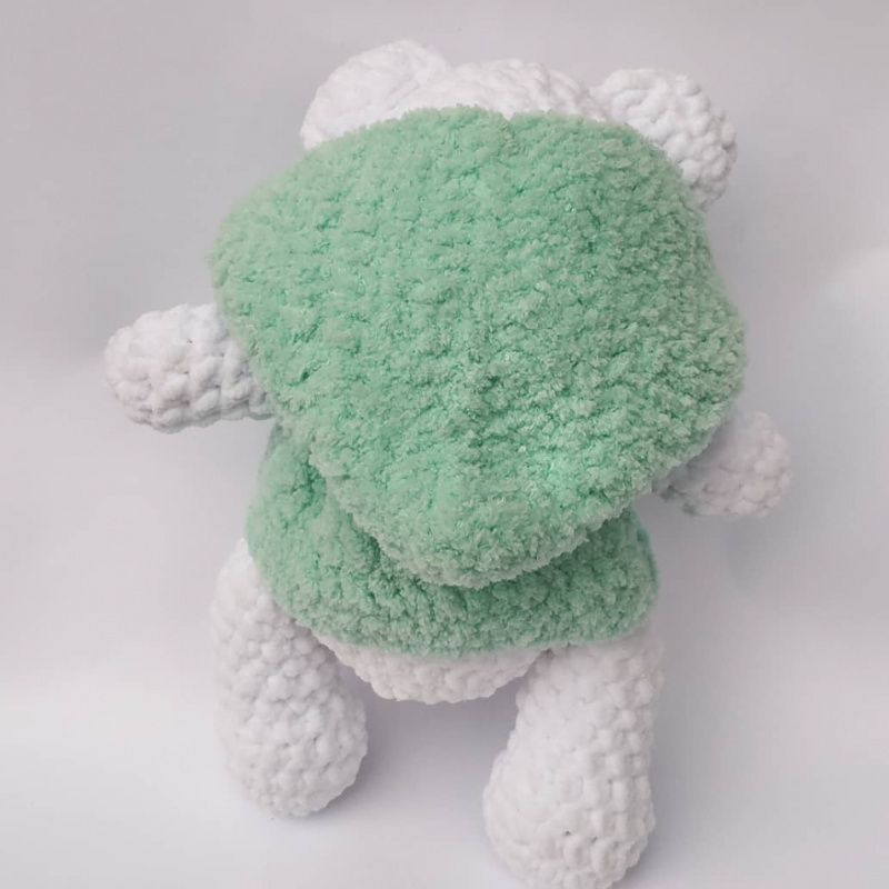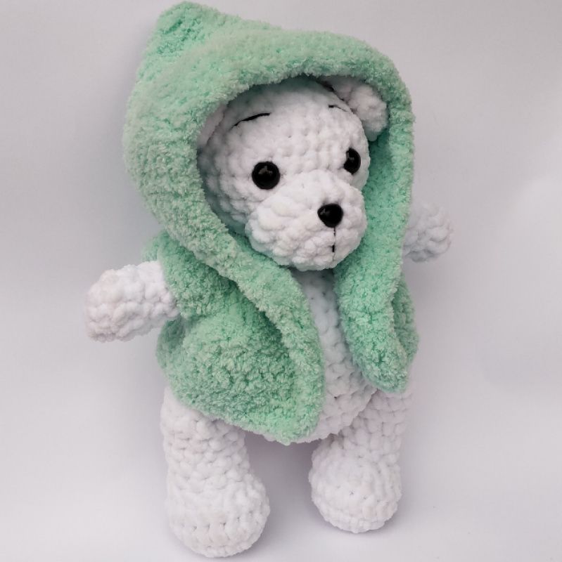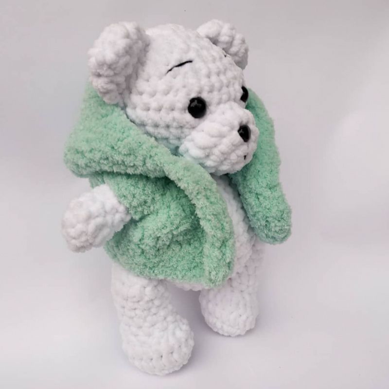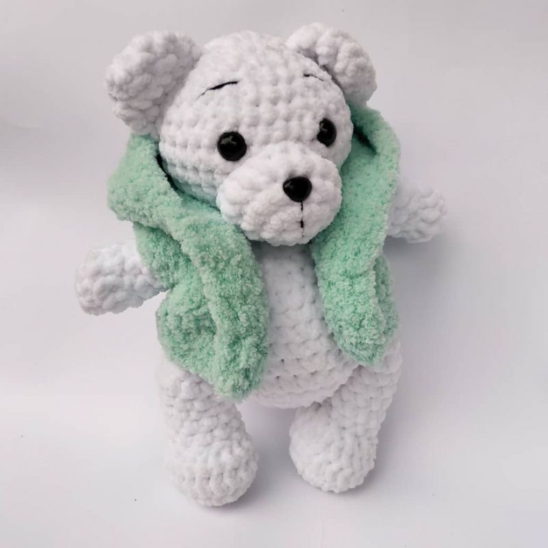 Ведмедик білого кольору в'язаний з плюшевої пряжі. У плюшевому жилеті. Жилетка знімається. Зростання Ведмедика 25 см, очі на безпечному кріпленні, наповнювач холлофайбер.