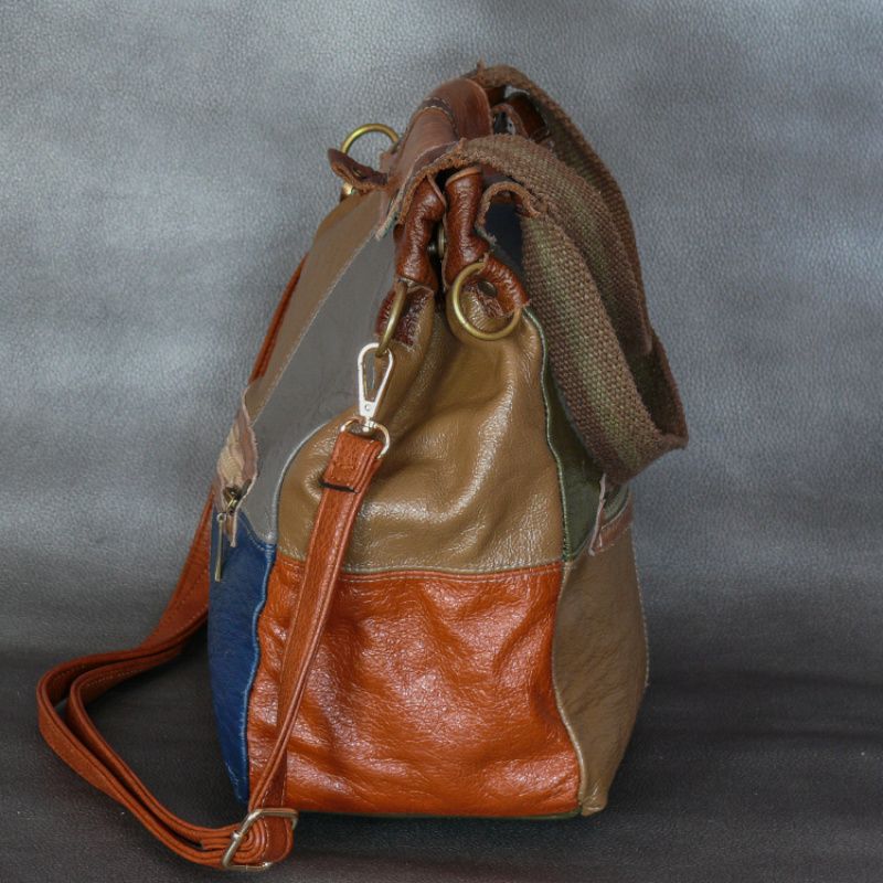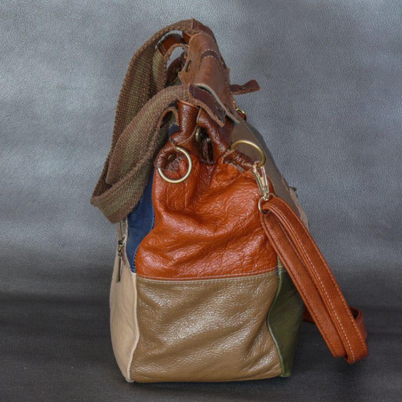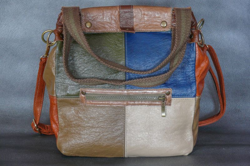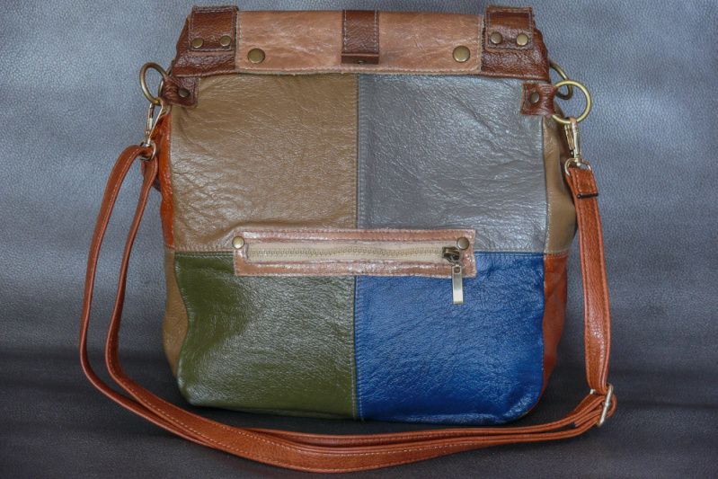 Жіноча сумка з натуральної шкіри. Колір: різнобарвна зі шматочків. Розміри (ВхШхГ): 32х27х10см. Зовні 2 кишеню, всередині 3 кишені + 1 потайний. Довжина ручки 110см.