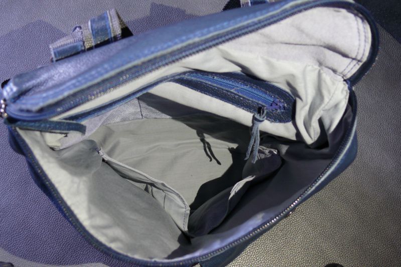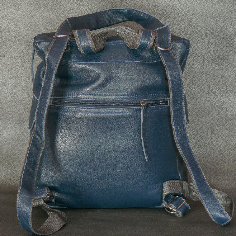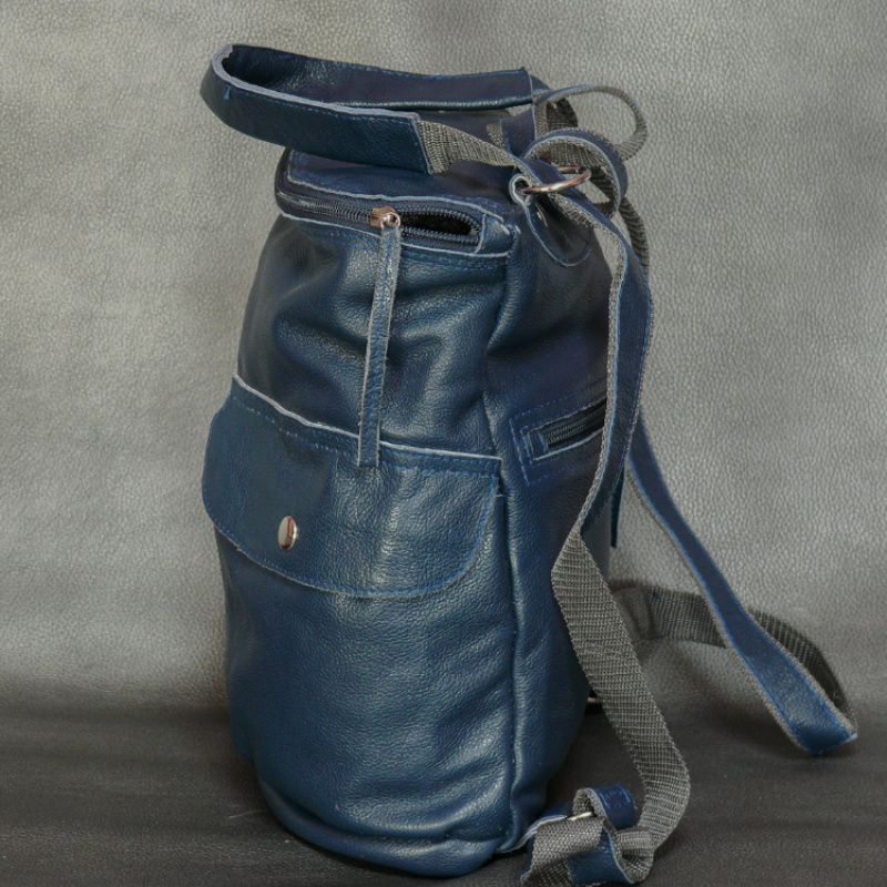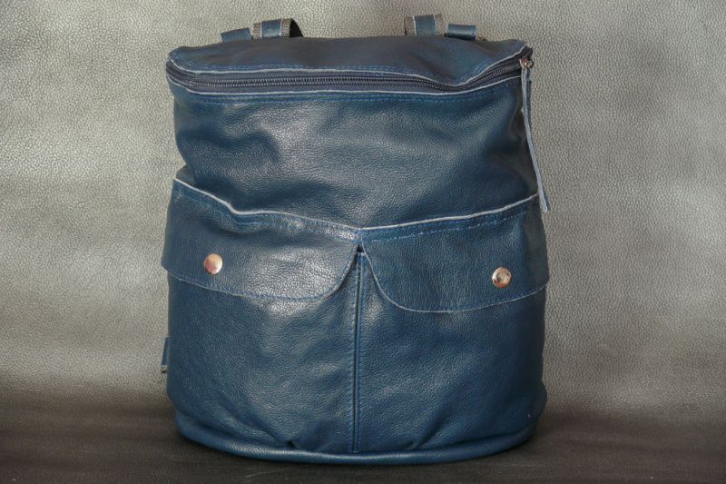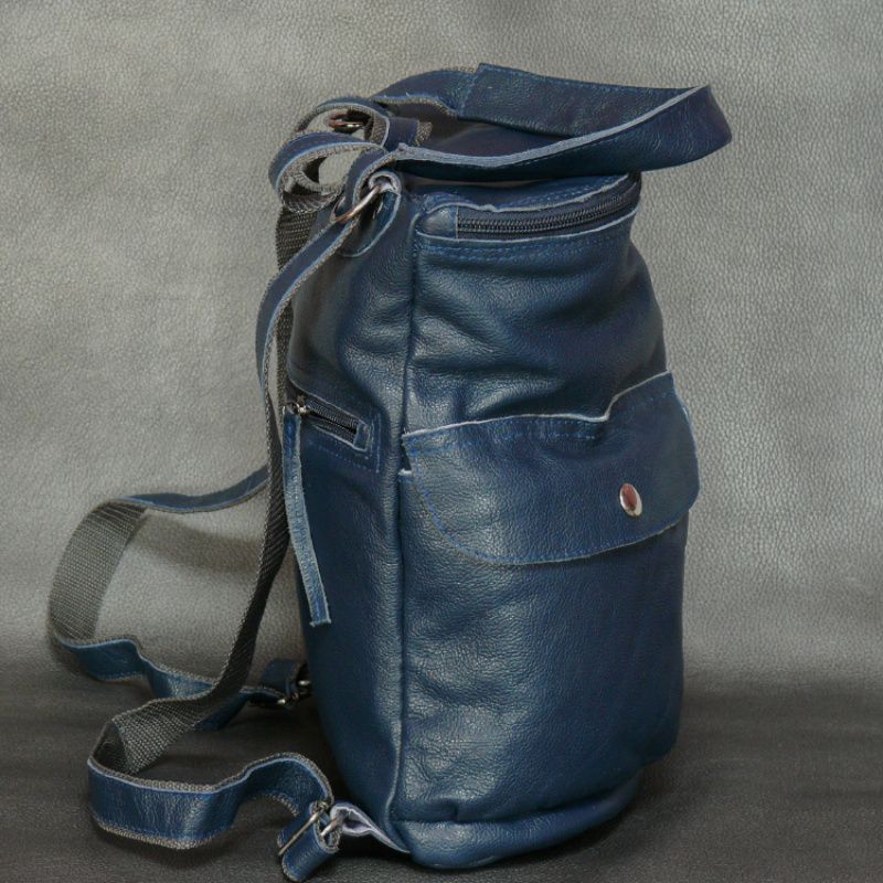 Жіночий рюкзак з натуральної шкіри. Колір синій. Розміри (ВхШхГ): 30х25х10 см; Зовні 2 кишені на кнопці + 1 кишеню на спинці з блискавкою, всередині 4 кишені + 1 потайний.