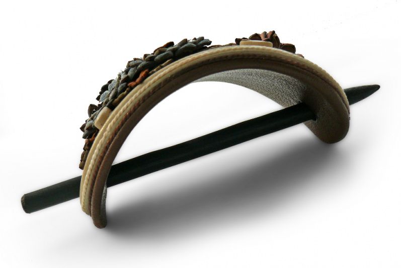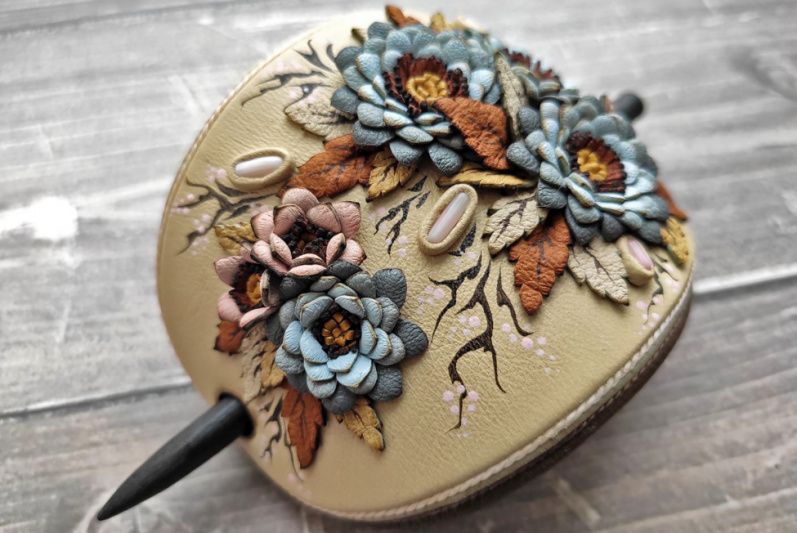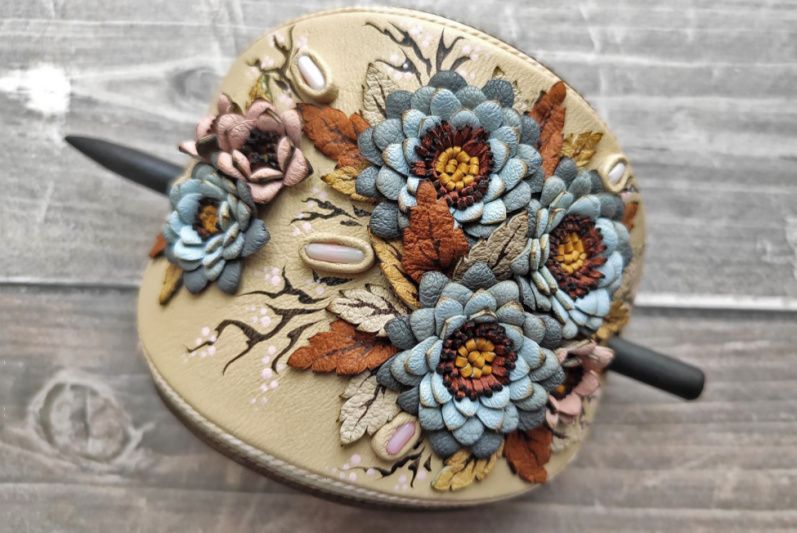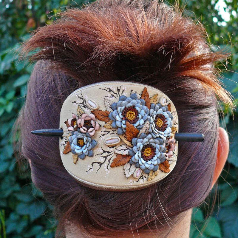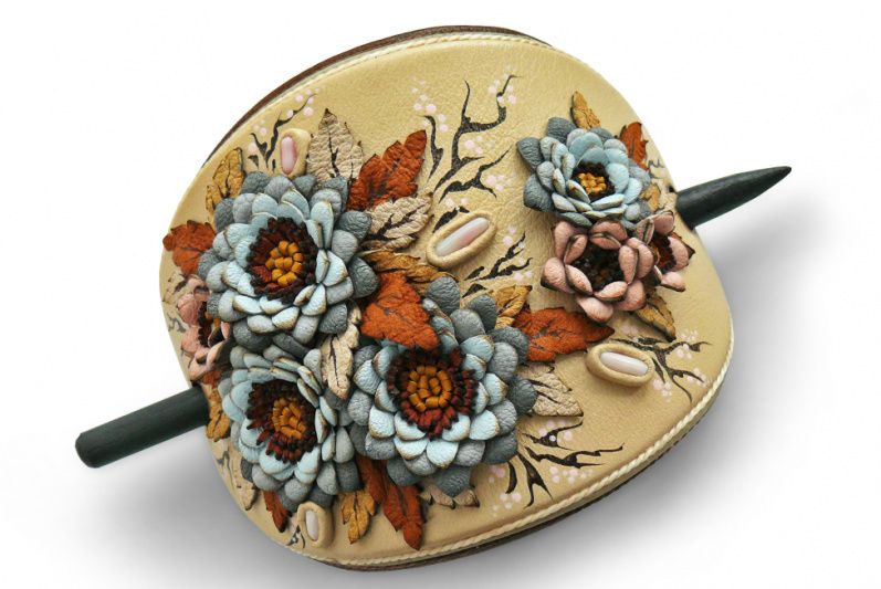 Шпилька для волосся з натуральної шкіри, на дерев'яній шпазі, з квітковим орнаментом і кораловими бутонами.