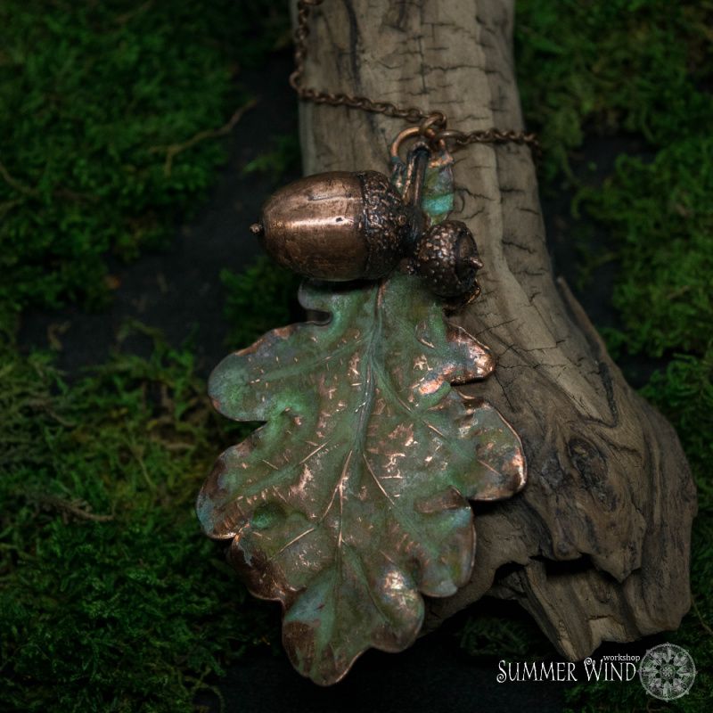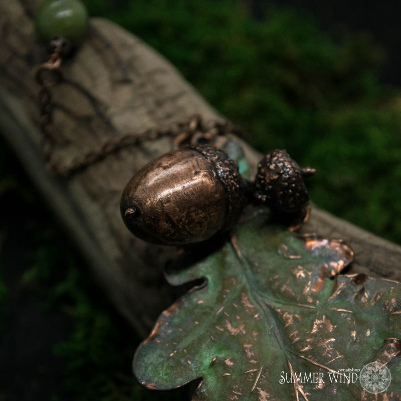 Справжній листочок дуба і жолуді вкриті міддю. Бусини - нефрит. Зелена і чорна патина. Виконано в техніці гальванопластика. Розмір - 8,3 х 5 см