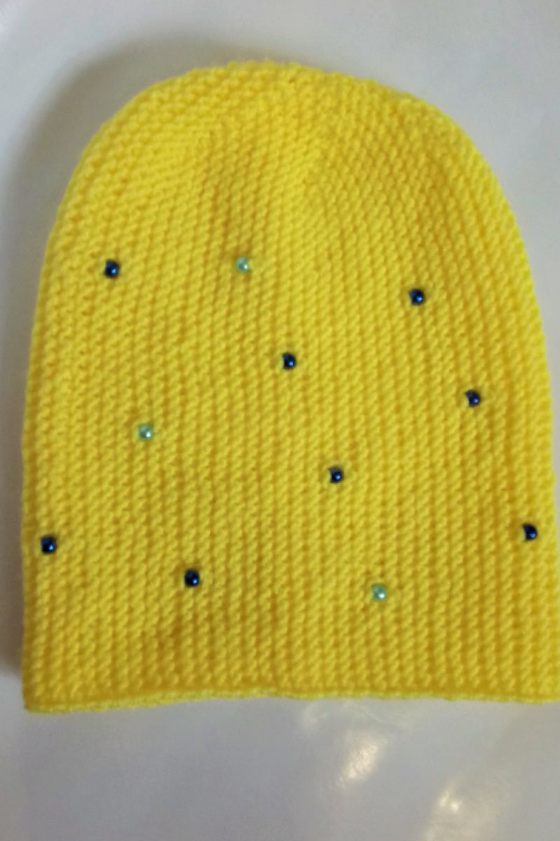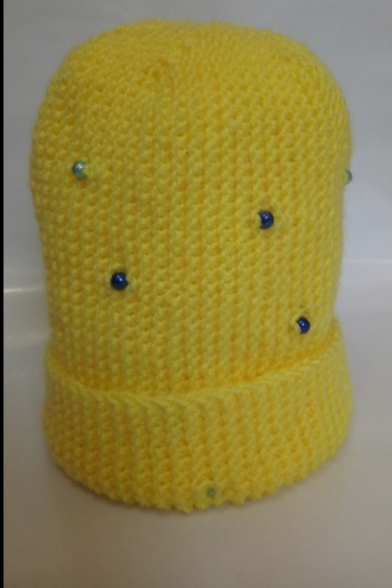 Ексклюзивна, ніжна, світла жовта шапочка "біні" на дівчинку. Шапка трансформер. Принт - сині і бірюзові намистинки. Матеріал - 100% акрил Без підкладки. Розмір шапки на обсяг голови до 50 см. Висота шапки 23 см.