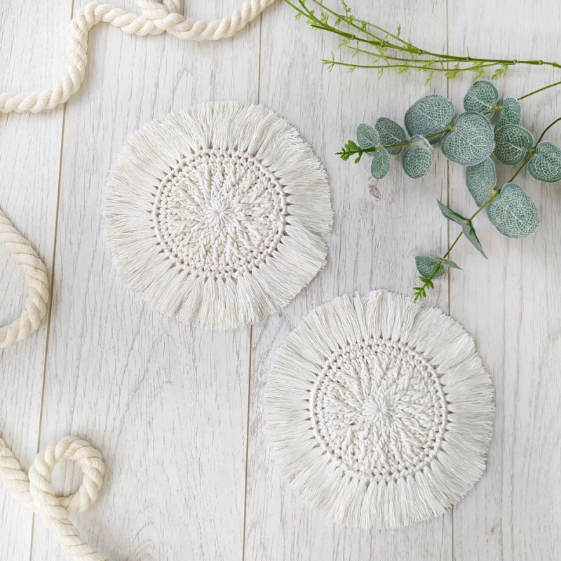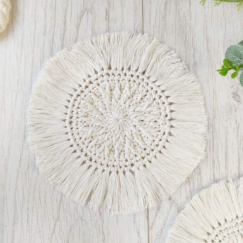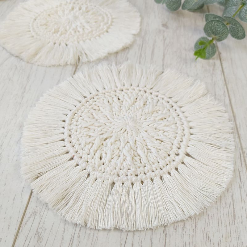 В'язані підставки з бахромою в стилі Бохо в молочному кольорі. Розпущена бахрома додає образу відчуття Бохо, яке ідеально доповнить теплу кухоль чаю або фруктовий літній напій. Гармонійно впишуться в ваш інтер'єр і красиво відтіняють композиції зі свічками. Діаметр серединки-10 см. Повний розмір з бахромою -18 см. У наявності-молочний і чорний колір. Якщо вам потрібен інший розмір або колір, напишіть мені. Ціна вказана за комплект з 2 шт.