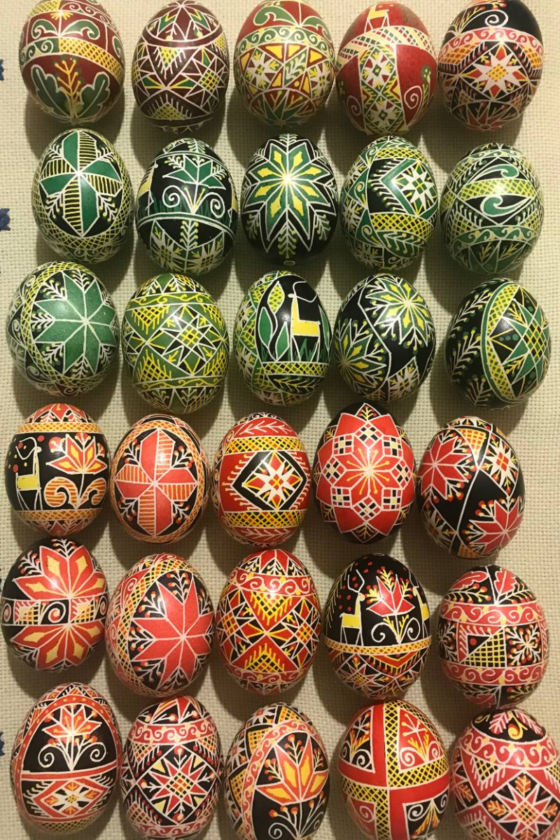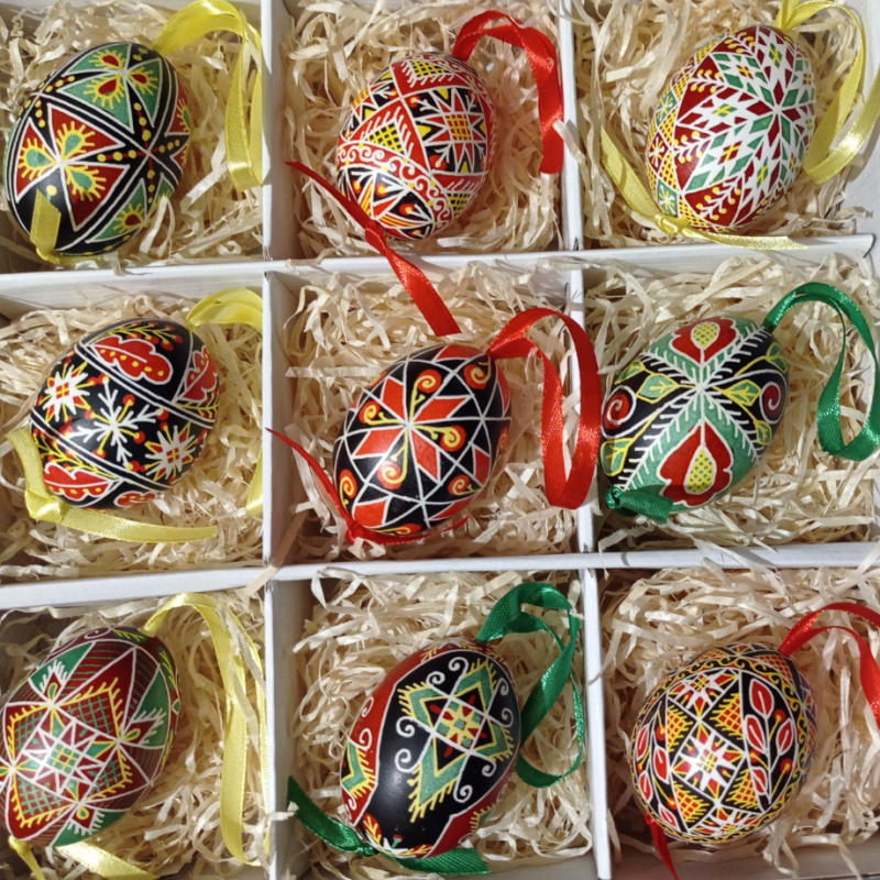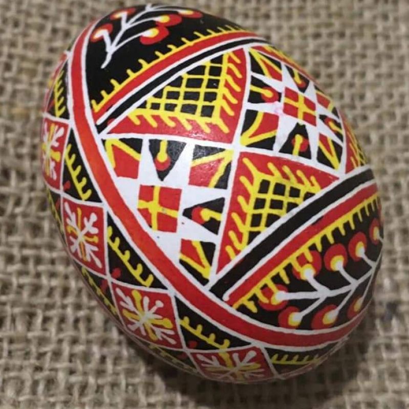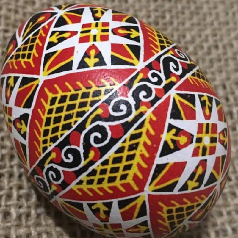Писанка написана на видутому курячому яйці, розписана воском за допомогою писачка.