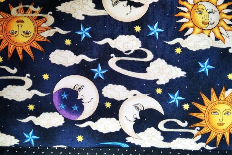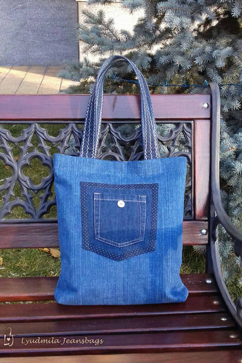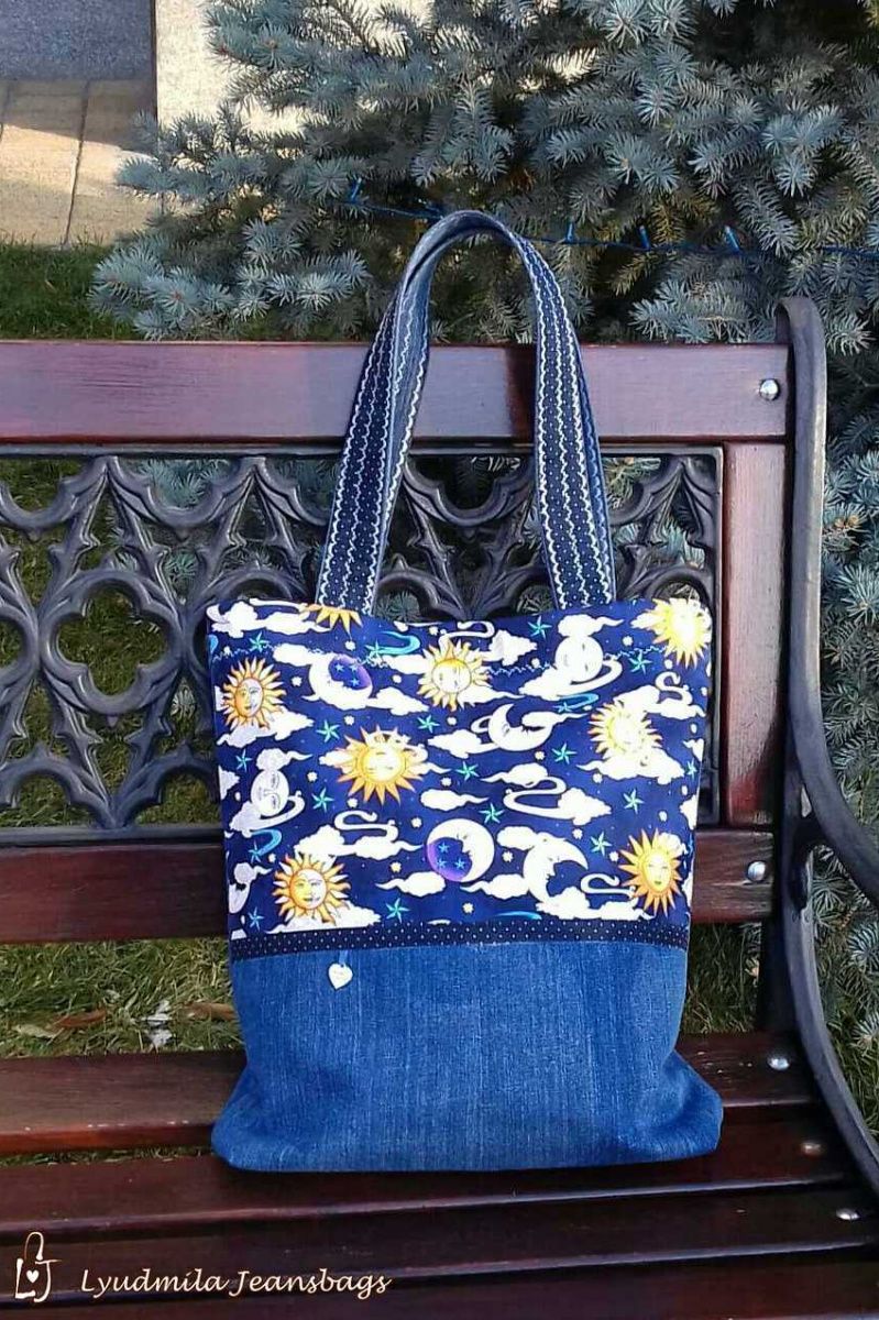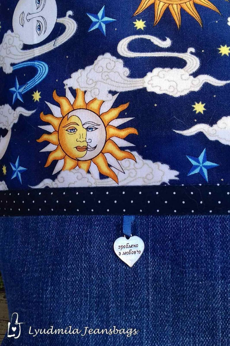 Чарівна сумка ручної роботи шукає власницю. Основа вироби - джинсова, На лицьовій стороні поставлено американський бавовна з яскравим зображенням, контури хмар на зображенні - золотисті. Також композиція доповнена поздовжньої темно-синьою смугою в горошок і прикрашена металевою підвіскою з написом. На зворотному боці сумки знаходиться кишеня в рамці з тієї ж тканини в дрібний горошок. Підкладка сумки - коттоновая, яскраво-помаранчева. Усередині знаходяться 3 кишеньки, краї яких декоровані фігурними строчками. Закривається сумка на магнітну кнопку. Ручки сумки - двоколірні: внутрішня сторона ручок - джинсова, а зовнішня виконана з тканини в горошок. Ручки і верхній край сумки оформлені наскрізними фігурними строчками. Денце сумки - ущільнено.