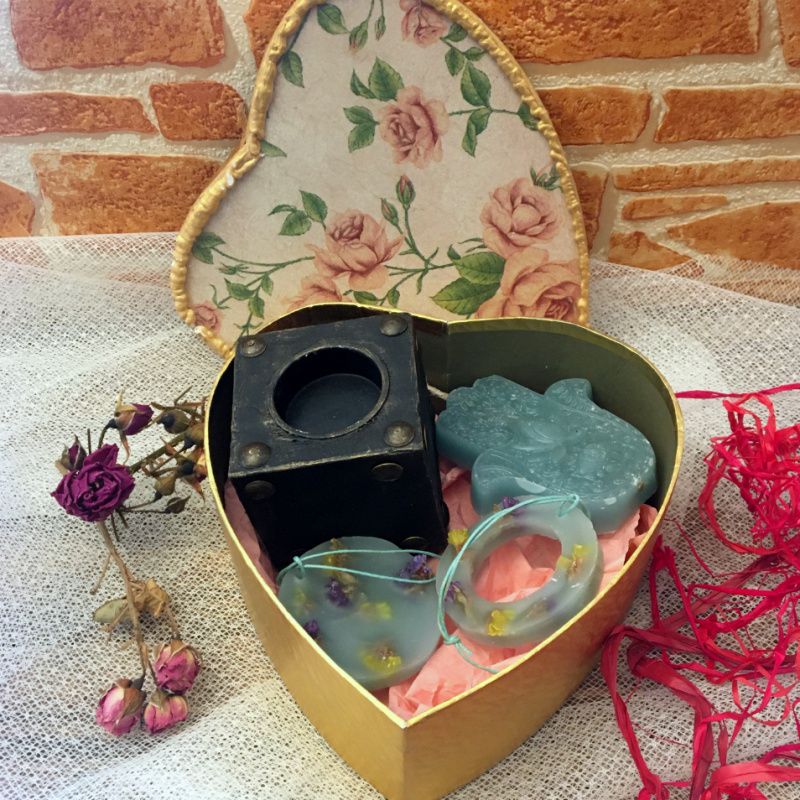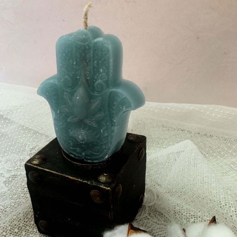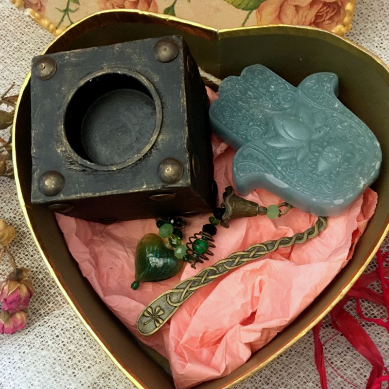 Подарунковий бокс включає в себе: Дерев'яний свічник ручної роботи Арома свічка "Рука Фатіми" з ароматом кориці і ванілі Два арома саше з таким же ароматом Арома саше можна замінити на закладку ручної роботи