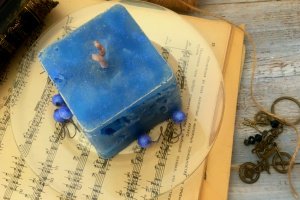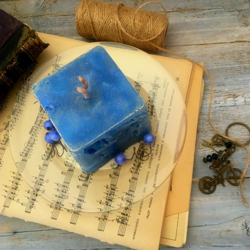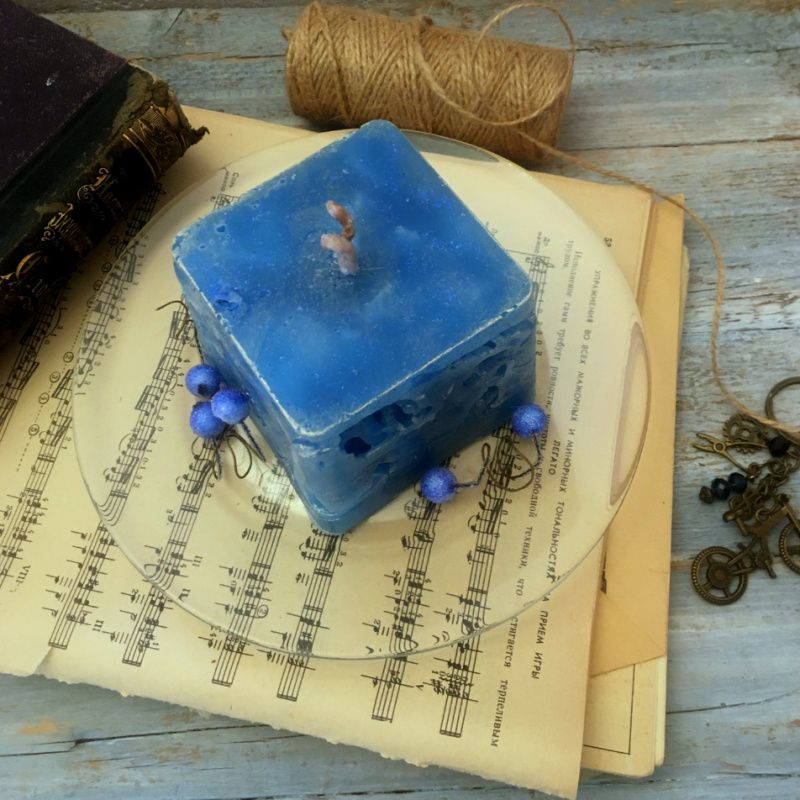 Велика свічка (підстава-8,5х8,5; верх-7,5х7,5; висота-7см) на підставці-свічнику: прозорим скляним тарілці. Може бути подарунком для чоловіка.