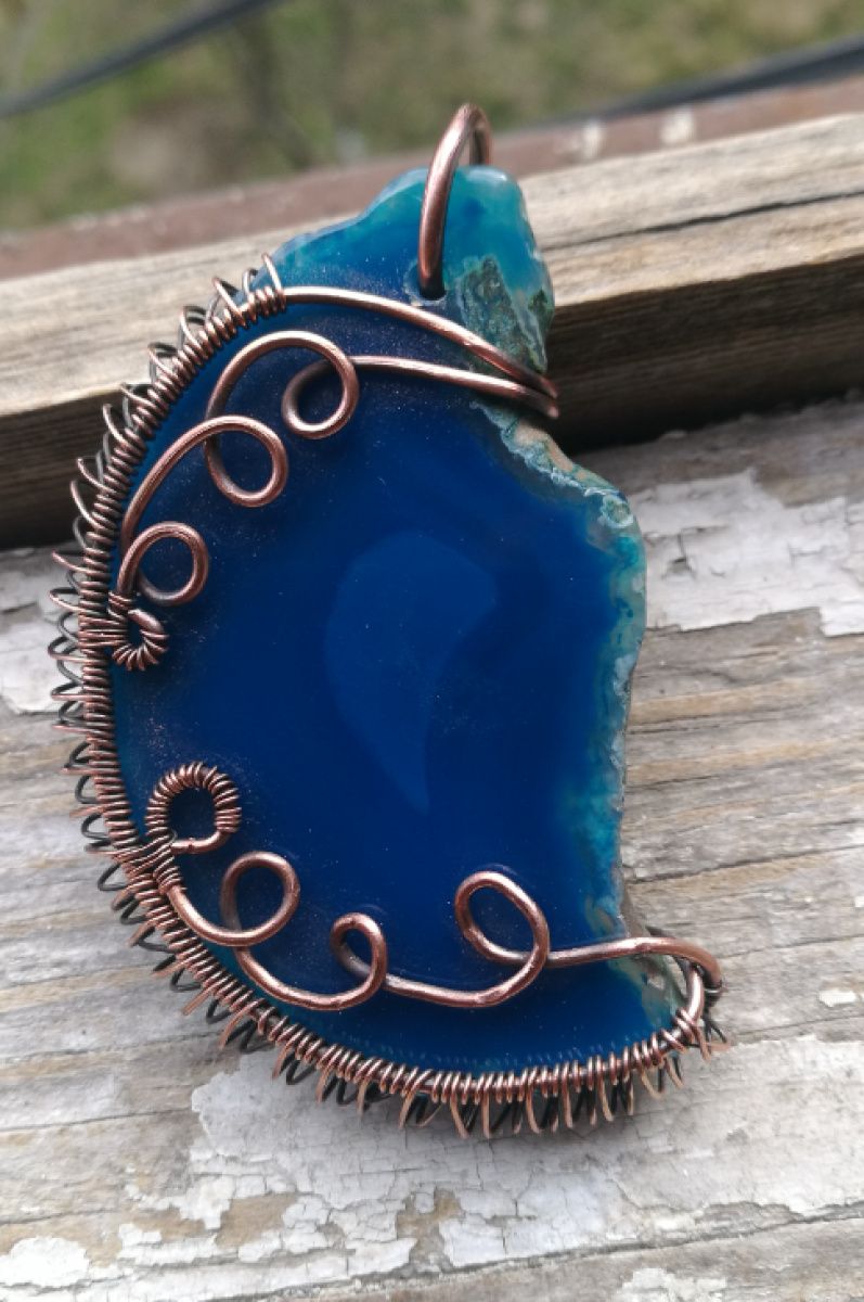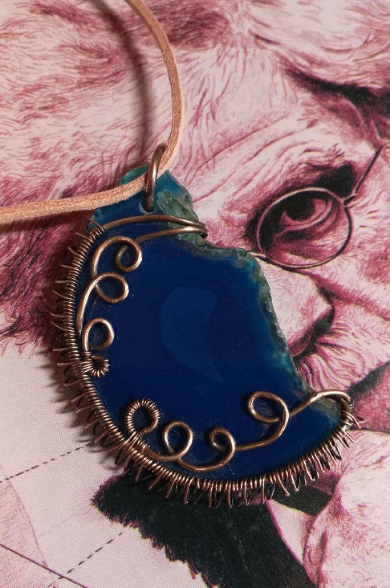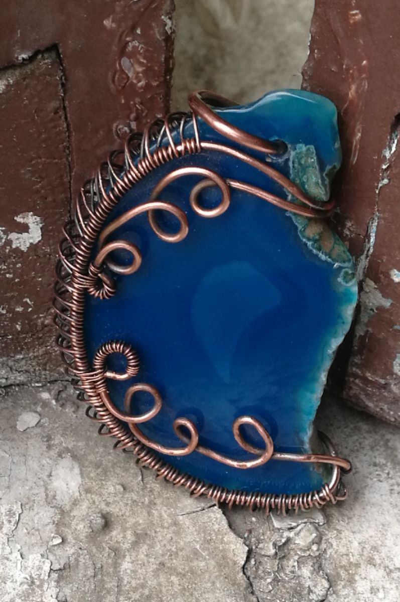 Красивий кулон з міді. Кулон виготовлений з міді в техніці Wire Wrap. Мідь Патинована і полірується. Якщо кулон з часом трохи поблекніт, його можна почистити. Всі елементи прикраси надійно закріплені. Виріб не покритий лаком для збереження властивостей натурального матеріалу. В прикраса використовувався камінь натуральний Агат Geode Polished. Вважається що агат приносить здоров'я, щастя і довголіття. Блакитний агат - камінь творчих особистостей, що розкриває їх таланти. Розмір виробу 6 см. На 4 см. Комплектується шкіряним шнуром із застібкою. Для збереження вироби в первісному вигляді не можна: - обмежити контакт з побутовою хімією. - довгий перебування виробу в воді.