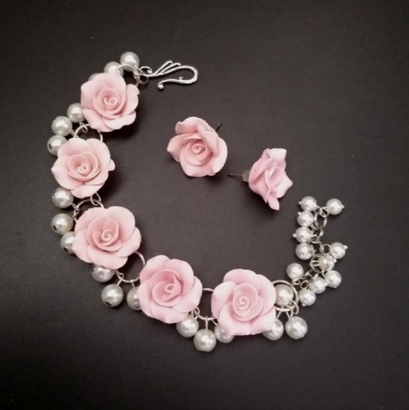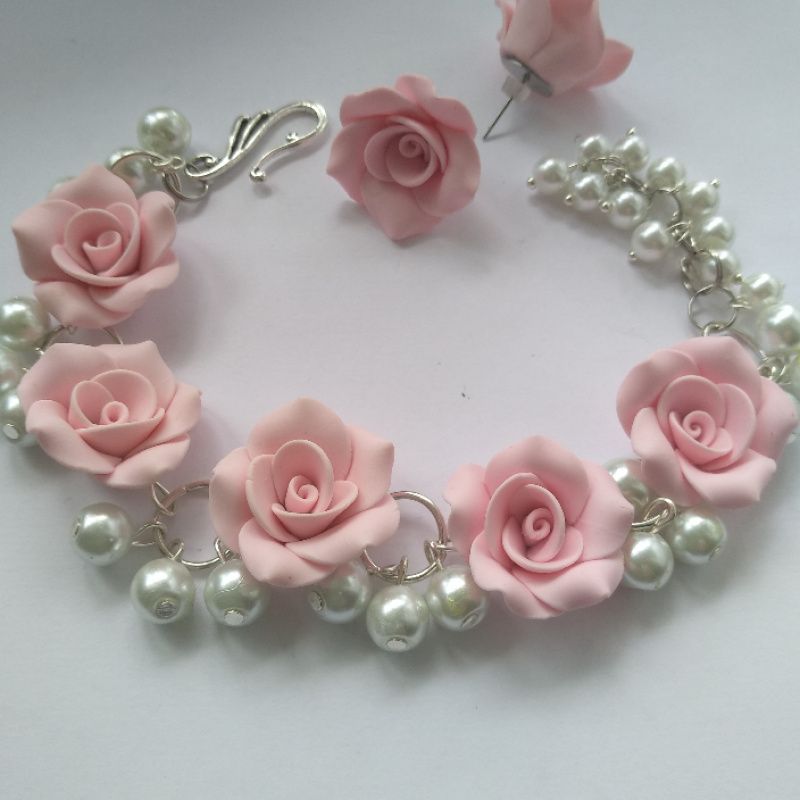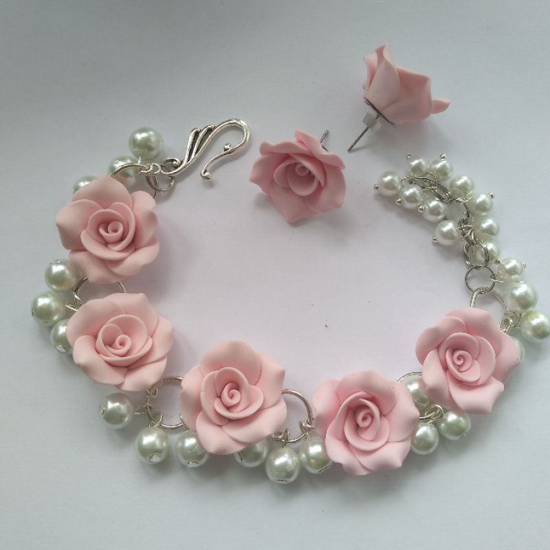 Браслет і сережки з ніжними трояндами. Троянди світло рожевого кольору, перли Майорка білого кольору. Авторську прикрасу ручної роботи з полімерної бельгійської глини. Прикраса по дуже демократичній ціні