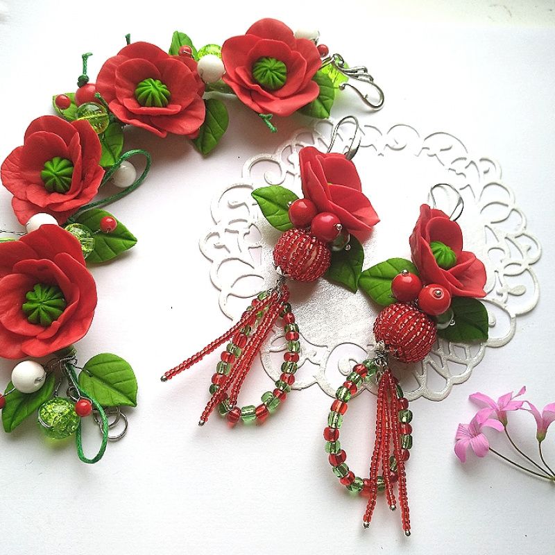 Набір прикрас з червоними маками та білим агатом. Прикраса виготовлена з полімерної бельгійської глини. Авторська ручна робота. Незвичайні довгі сережки з бісерними кульками довжина 7/див. На срібних швензах 925 проби. Модель продається з великою знижкою, Ошатне прикраса дуже незвичайне