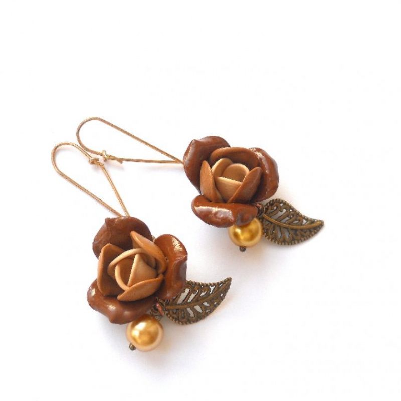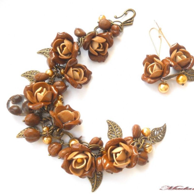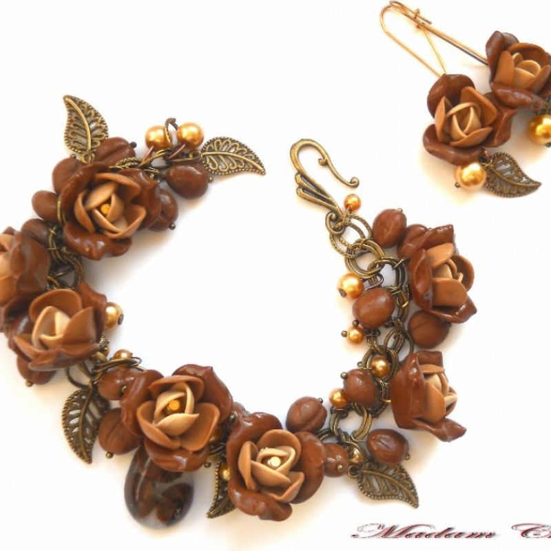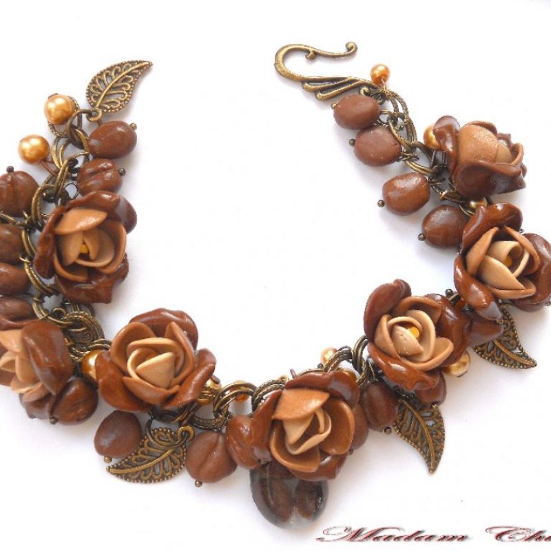 Цікава прикраса в вінтажному стилі, змішана техніка. Троянди виліплені з полімерного бельгійського пластика 3 відтінків беж, світлий шоколад, чорний шоколад. Підвіска натуральна кава в епоксидної глазурі. Зерна кави виліплені вручну, антична бронза, перли золотистого кольору Майорка. Авторську прикрасу ручної роботи.