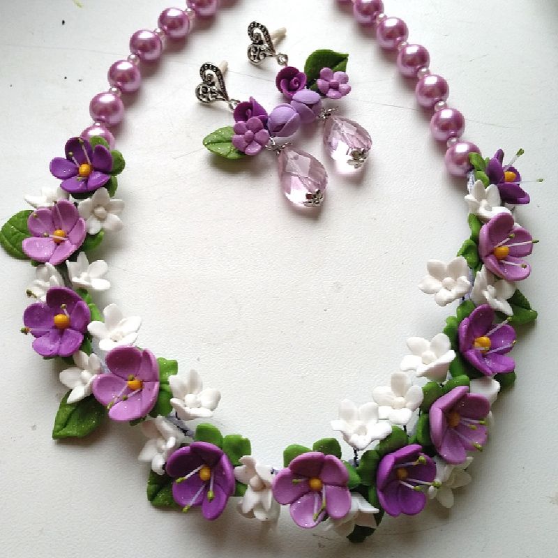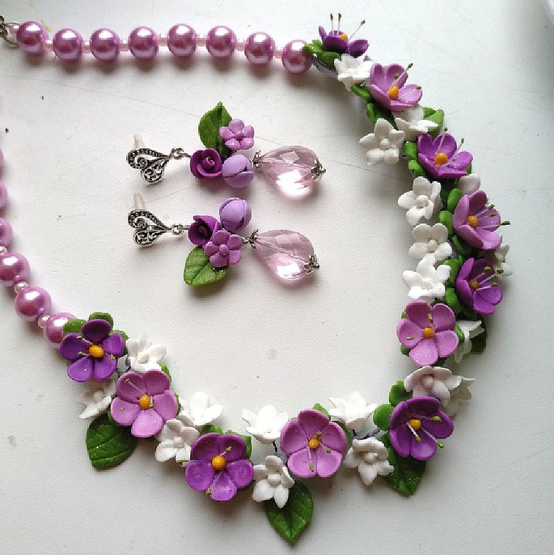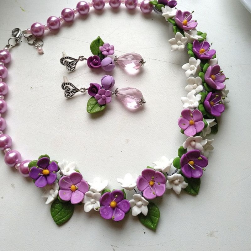 Кольє і сережки з полімерної глини з бузковими і фіолетовими квітами. Яскрава прикраса зроблено в бузково рожевих фіолетових кольорах. Авторська ручна робота. Кольє невелике зроблено в лаконічному стилі мінімалізму. Довгі сережки з великими кристалами рожево бузкового кольору ограновування Сваровські. Перли Майорка рожево бузкового кольору якісний. Кольє 45-47см, сережки 6см