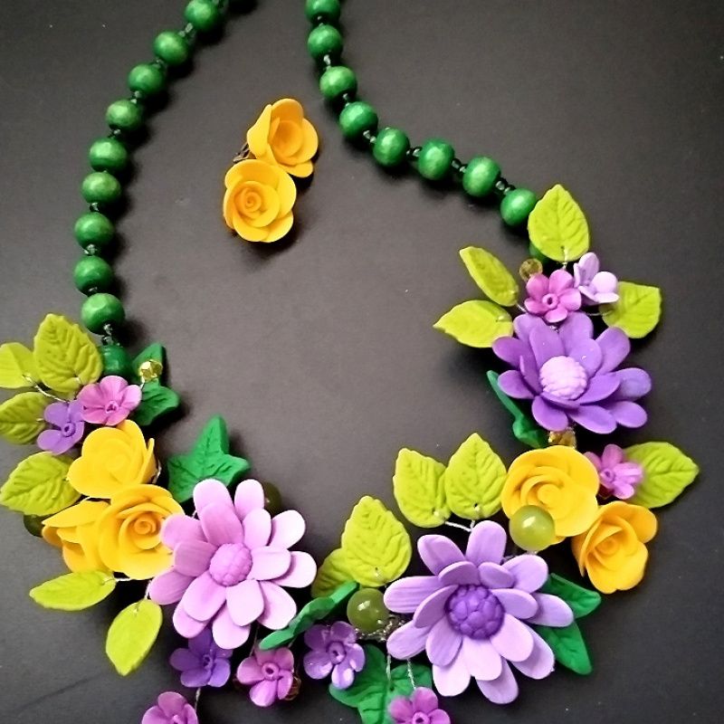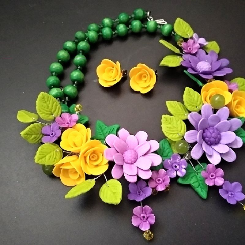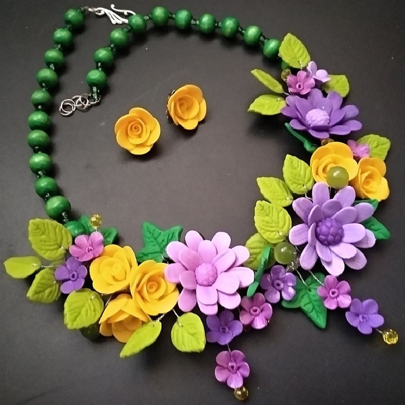 Яскраве, насичене кольором прикраса. Чудове поєднання відтінків бузкового кольору, жовтого, зеленого, салатового. Поєднання матеріалів дерева, кришталю, перлів. Авторська неповторна ліплення з збірка. Прикраса живе, натуральне, гармонійне. Одне з моїх найбільш вдалих прикрас