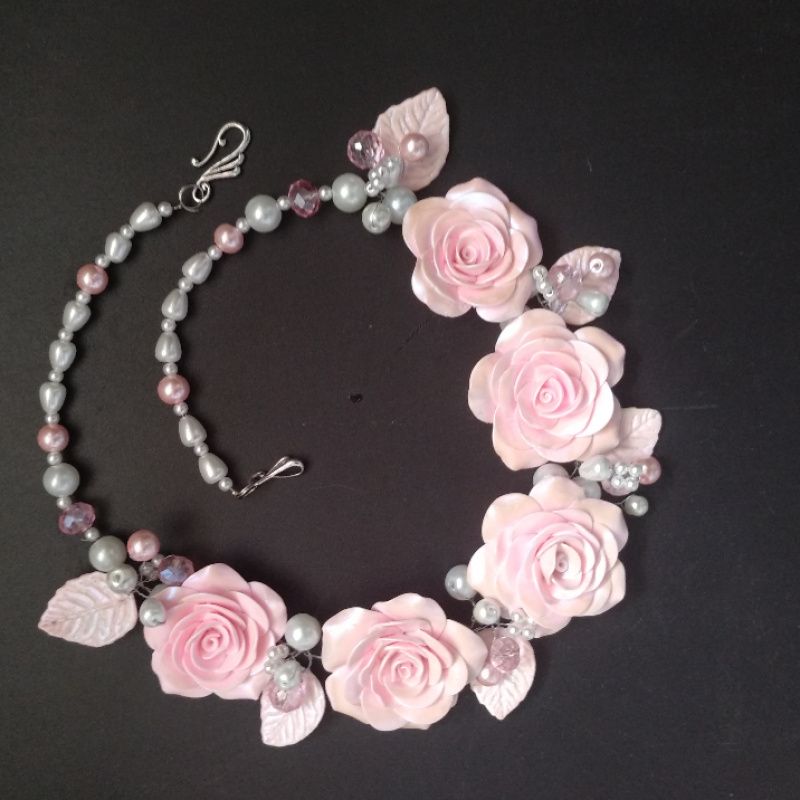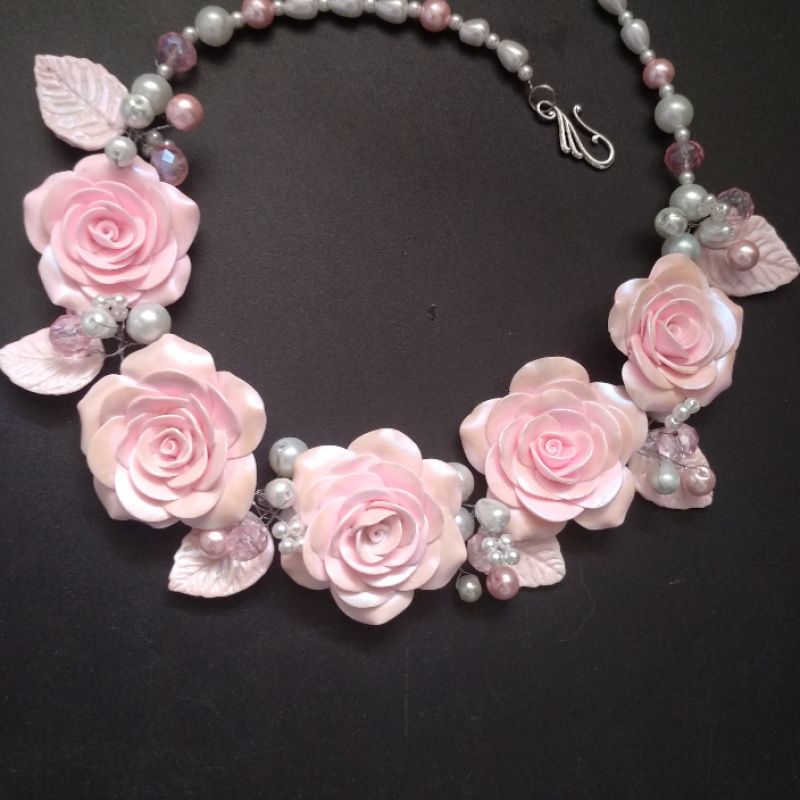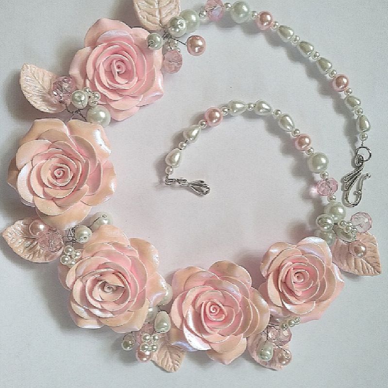 Авторську прикрасу ручної роботи з полімерної бельгійської глини з великими рожевими трояндами, перлами, кришталем. Троянди покриті перламутром. Колір троянд змінюється від заломлення кольору.