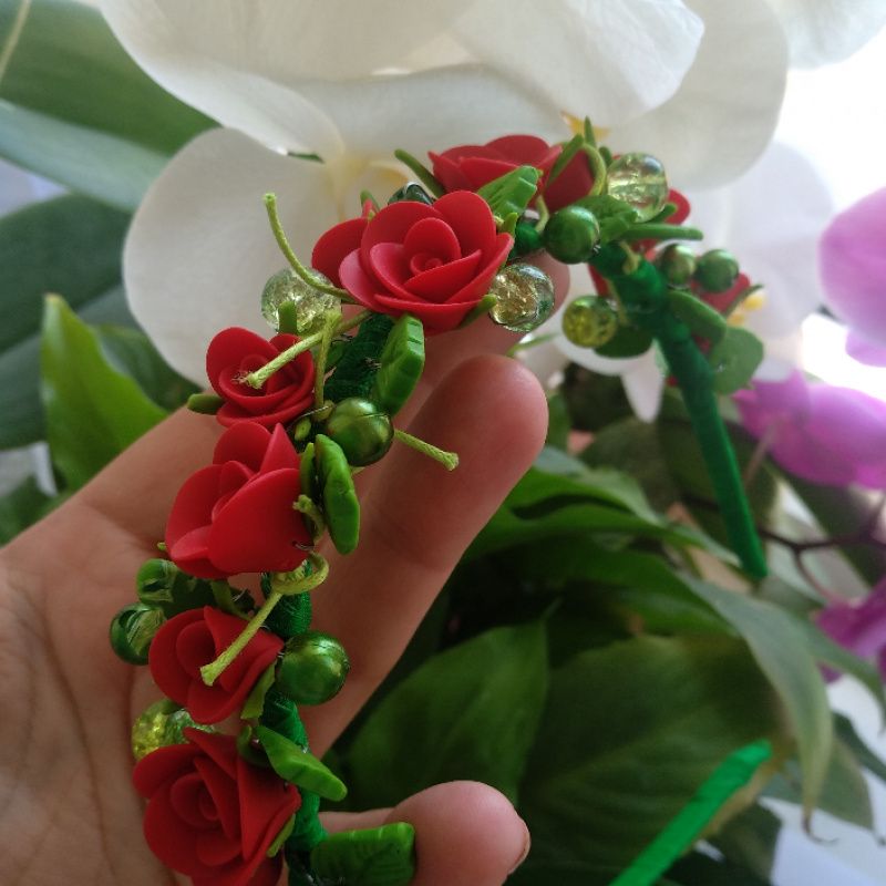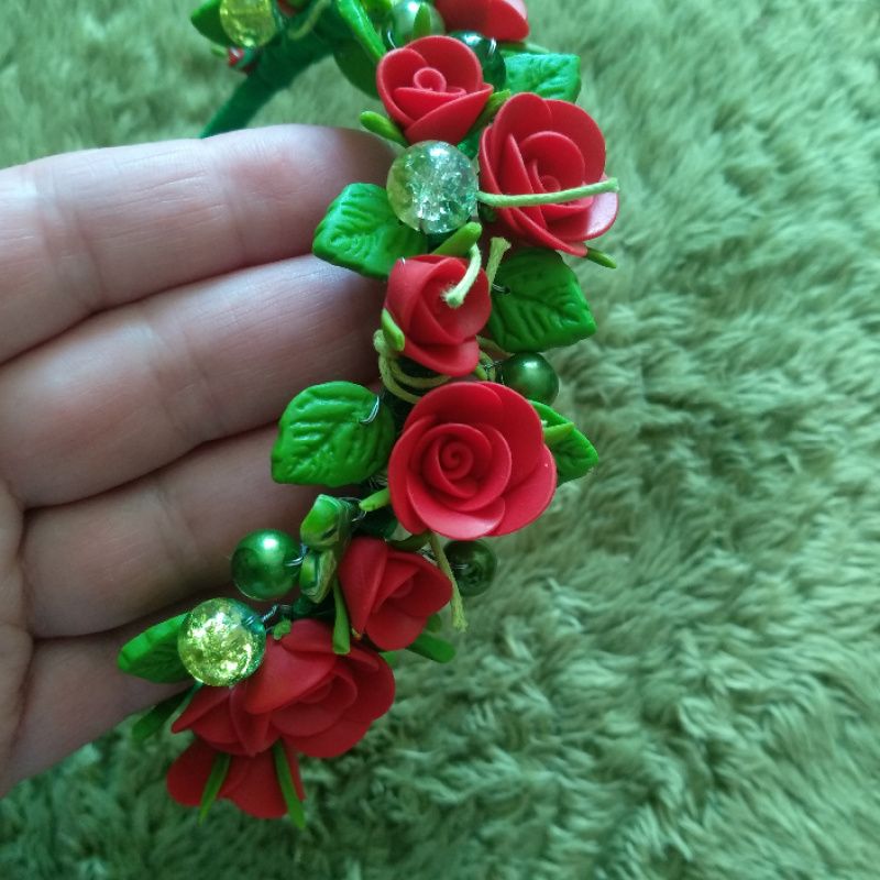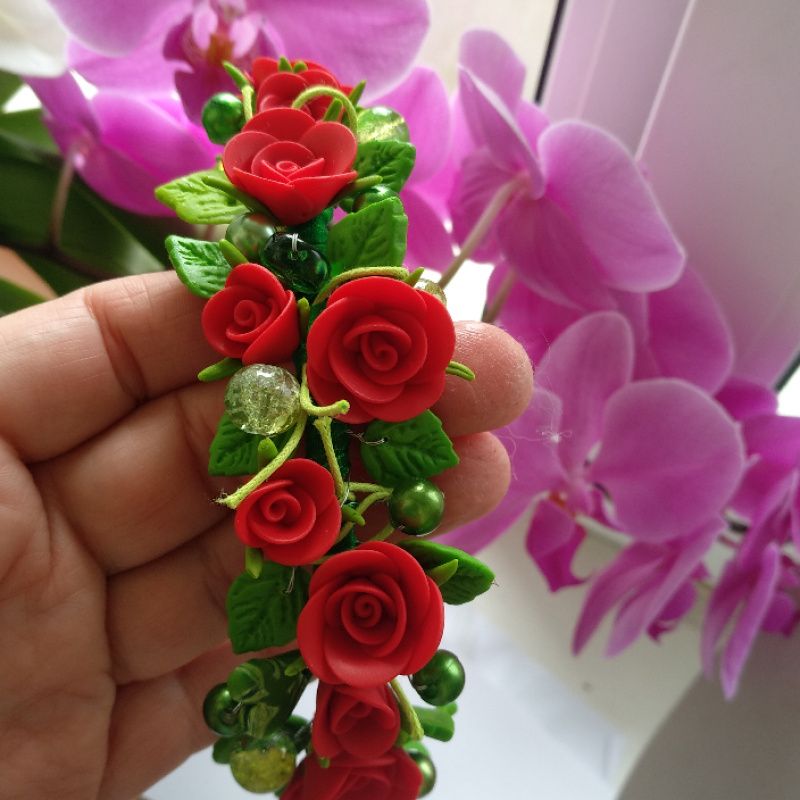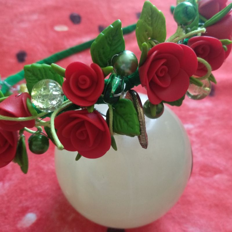 Дуже красивий обруч з червоними трояндами, зеленими намистинами з чеського скла # кракле #, перлами. Дуже гарне святкове прикрашання, під яке можна замовити колечко, сережки, браслет. Прикраса ручної роботи з полімерної бельгійської глини. Авторська ручна робота без використання молдавсько.