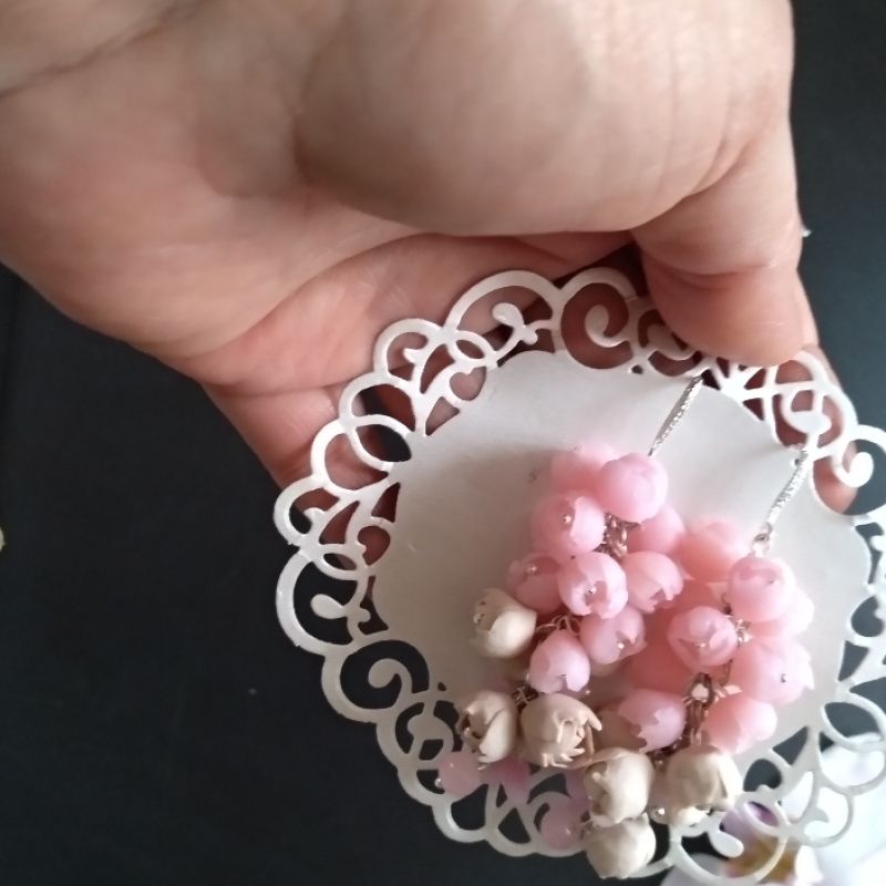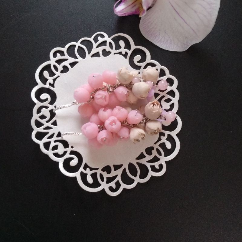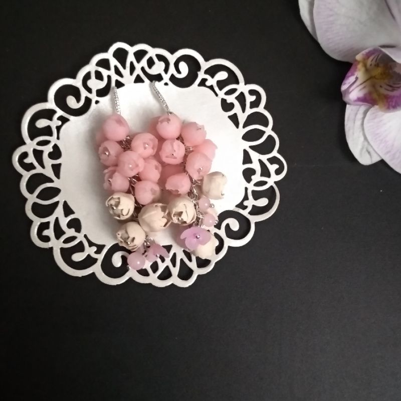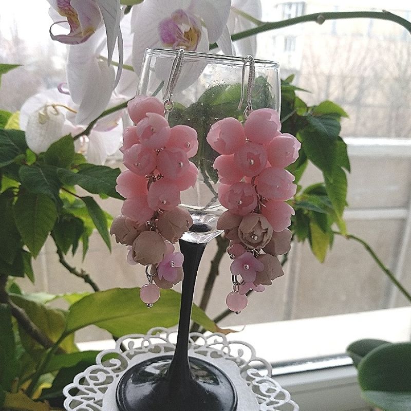 Довгі сережки з бутонами півонії прозоро рожевого кольору та пастельного. Кожна пелюстка у квітці виконана вручну без використання молдів. . 240 пелюсток із дрібними зубчиками. Тонка ажурна ліплення. Зібрано сережки на сріблясту фурнітуру. Швензи на сережках 925 проби. Довжина сережок 6см.