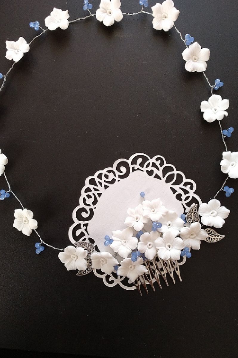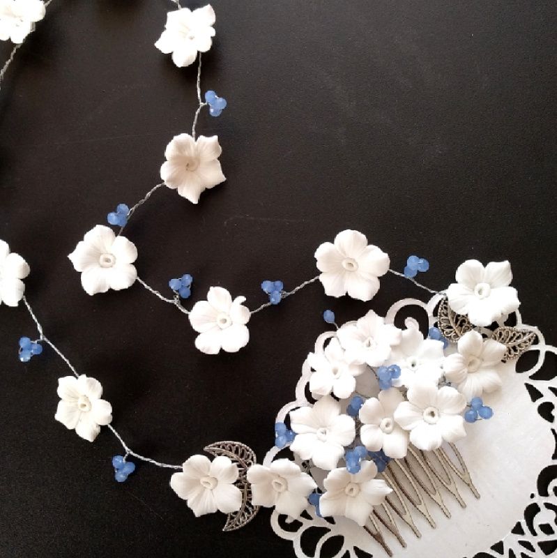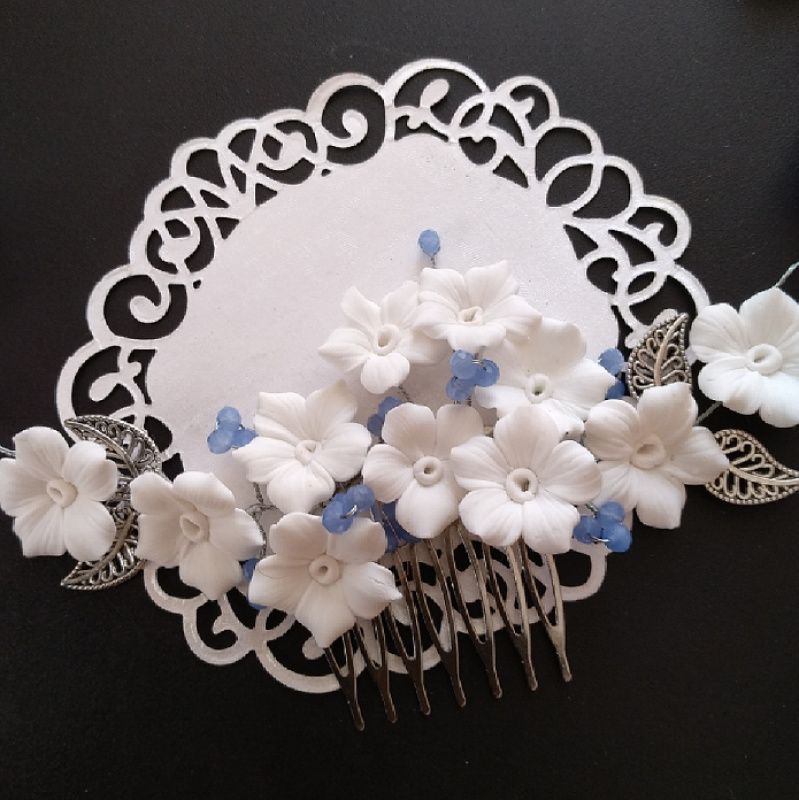 Весільна прикраса для волосся гребінь та гілочка. Авторська прикраса ручної роботи. Квіти Виліплені із полімерної бельгійської глини. Квіти дуже гарної форми, ніжні, світлий блакитний кришталь. Повторення роботи в будь-якому кольорі. Робота на замовлення
