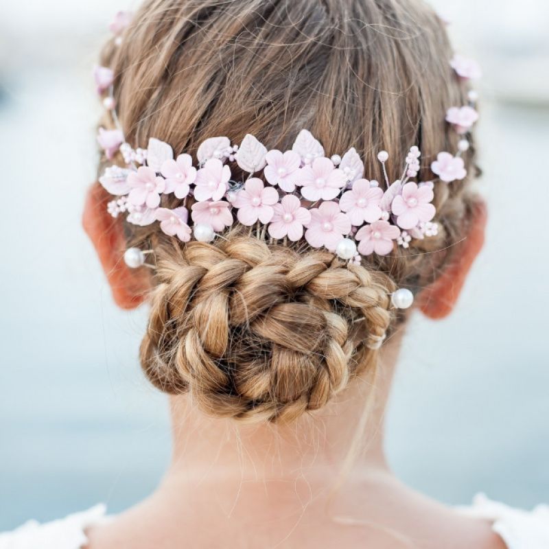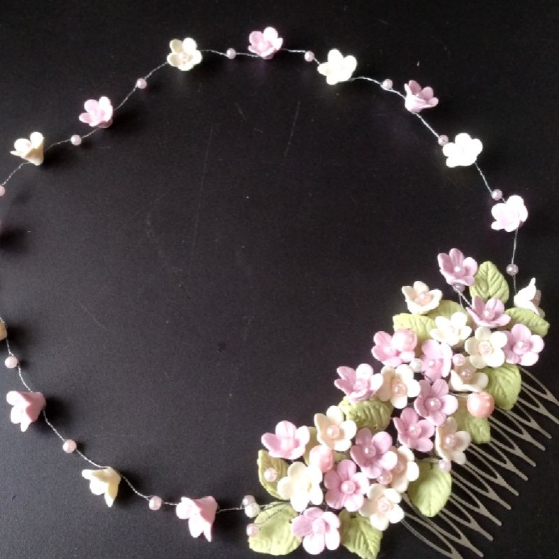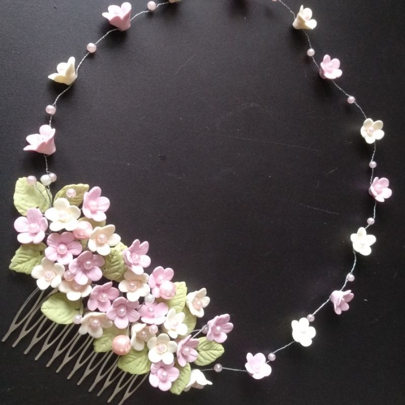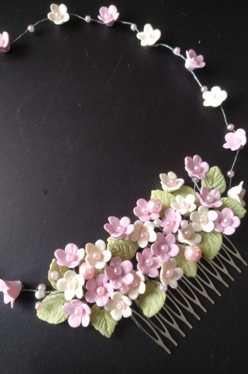Весільний гребінь з квітами рожевого і айвори кольору. Гребінь у вигляді віночка. Прикраса авторська ручна робота. Квіти міцні не бояться води. Прикраса зібрано на ювелірну сріблясту дріт з покриттям. Прикраса не темніє