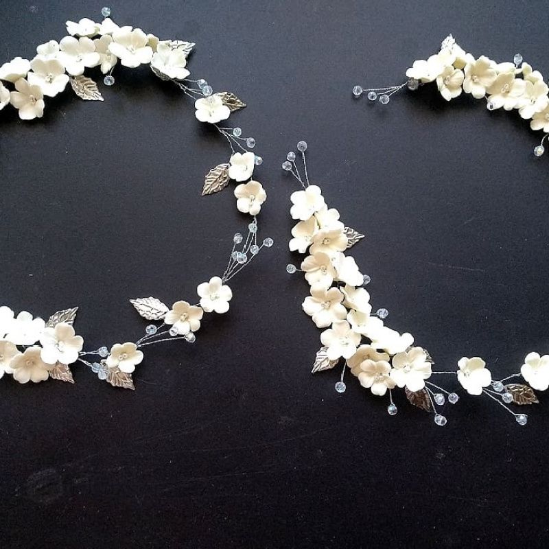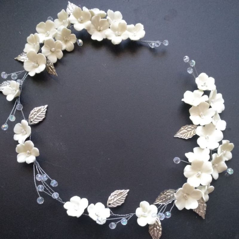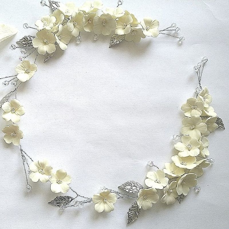 Ніжний весільний вінок з невеликих квітів з японської глини кольору світле айвори, кришталь, сріблясті листочки. Вінок зібраний на срібну ювелірну дріт з покриттям. Прикраса витончене для класичної весілля .Довжина вироби 39-49см під замовлення. Прикраса за демократичною ціною.