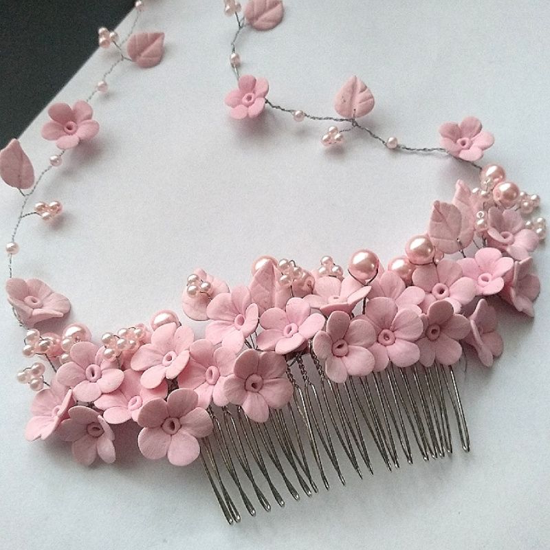 Гарний вінок з рожевими ніжними квітами із полімерної бельгійської глини. Авторська прикраса ручної роботи. Дрібні світло рожеві перли. Вінок кріпиться на гребені. При замовленні прикраси вкажіть коло голови.