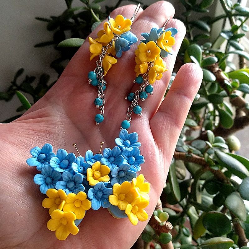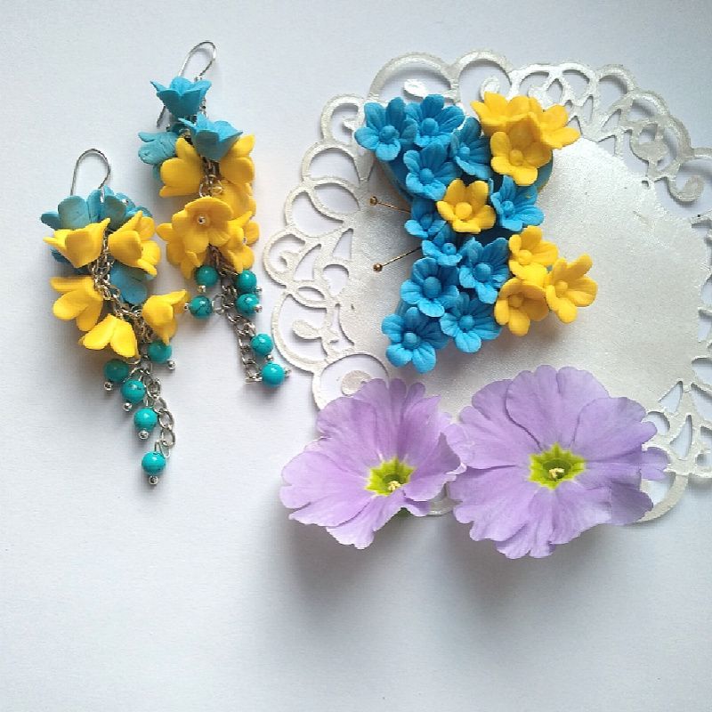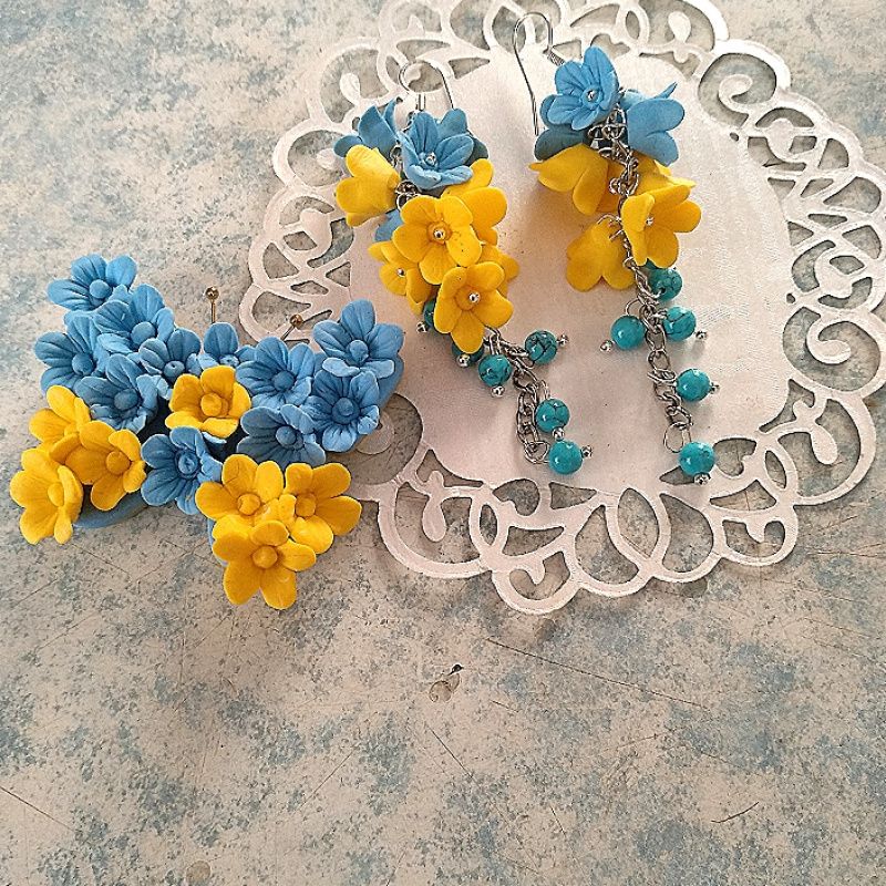 Жовто-блакитна прикраса сережки і брошка замість брошки можливо зробити кулон прикрасах зроблена із полімерної бельгийскої глини авторська ручна робота. Довгі сережки з маленькими квітами і бусинами бірюзи прикраса зроблена жовто-блакитного кольору Д длина метелика 6 см. Сережки. 6см. Цінуй українське.