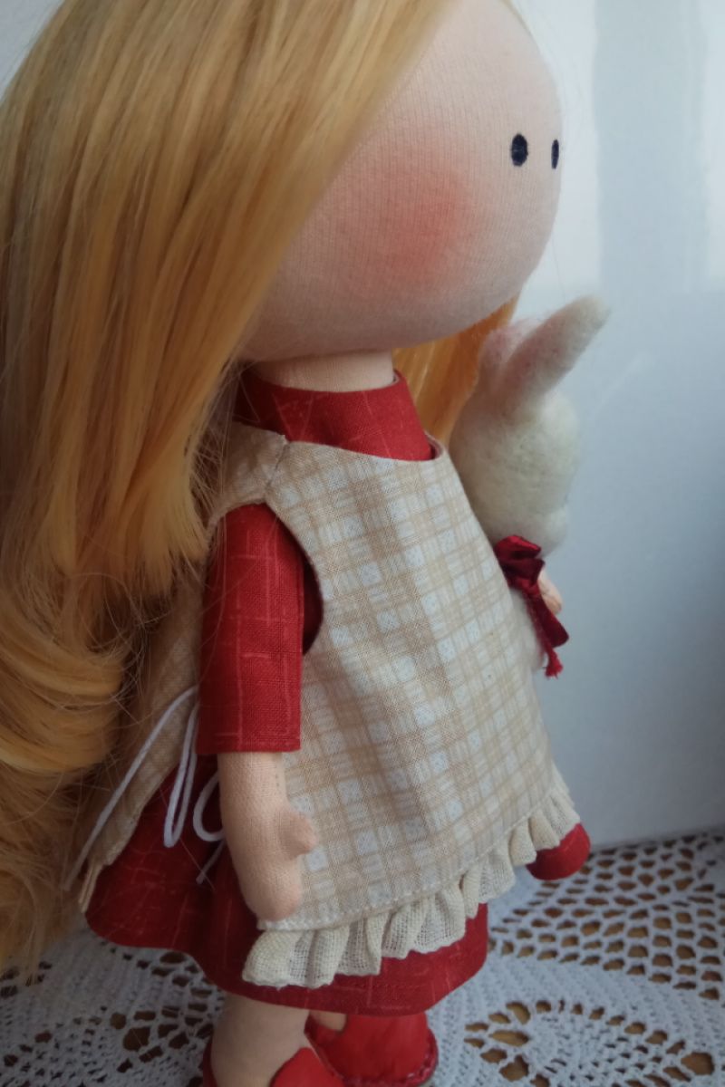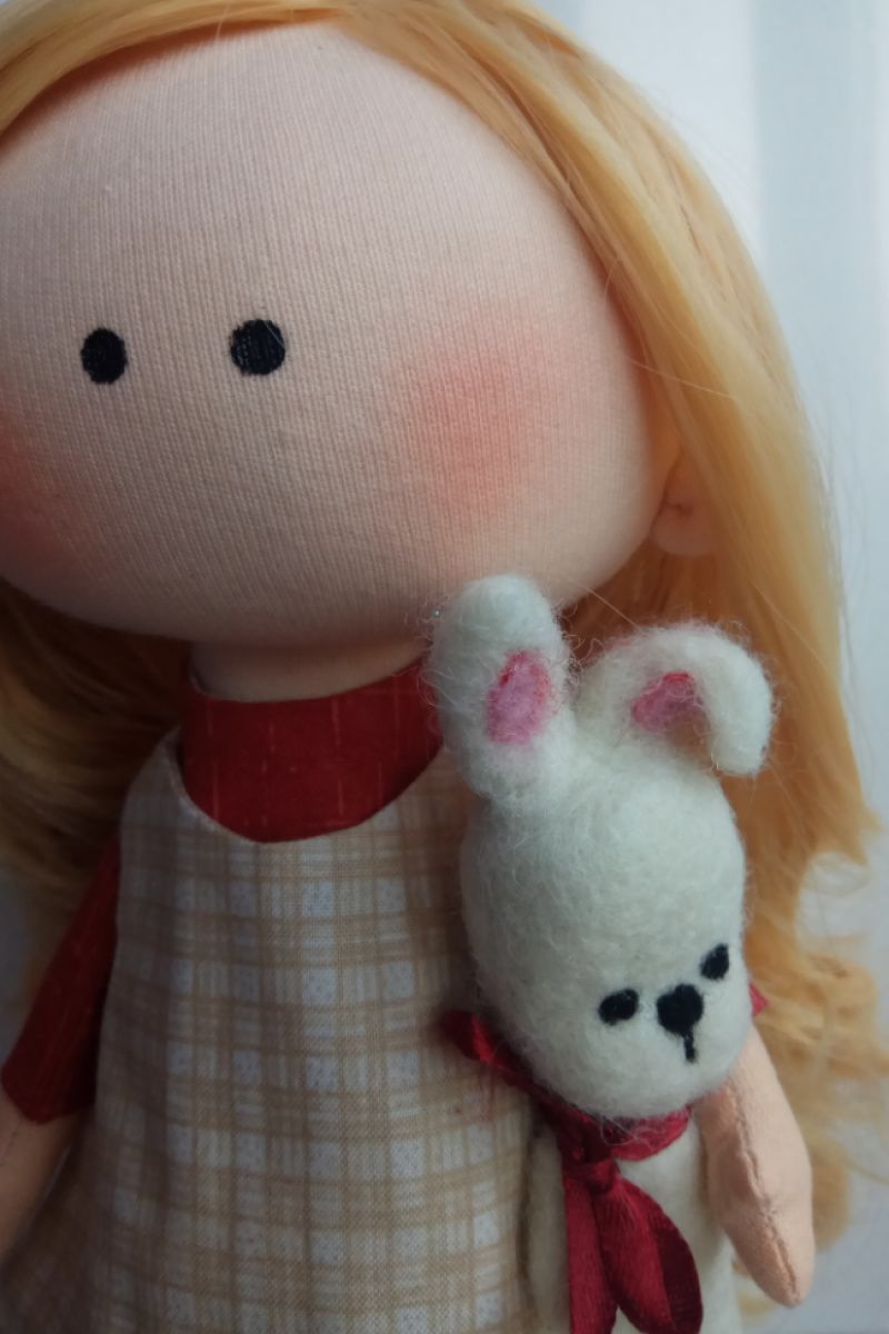 Цікава,ніжна лялечка,стане гарним подарунком.Одяг знімається частково, можна змінювати зачіску,має маленьку іграшку валяную з вовни
