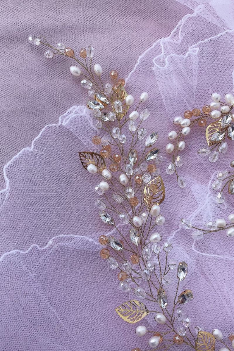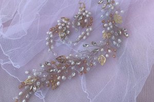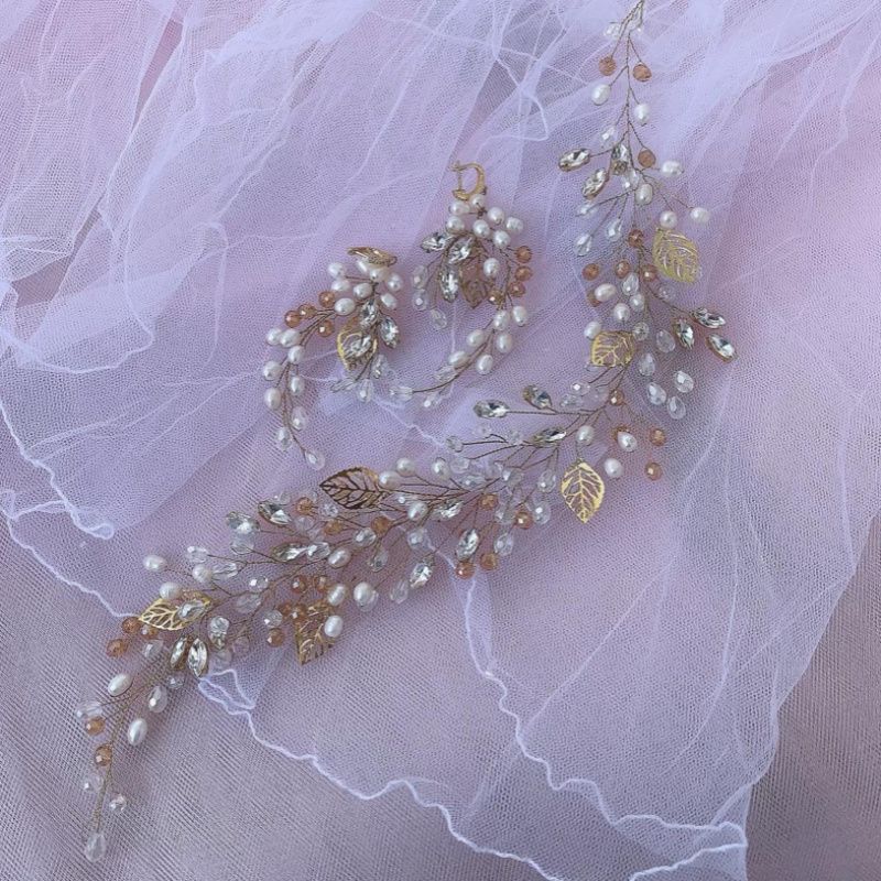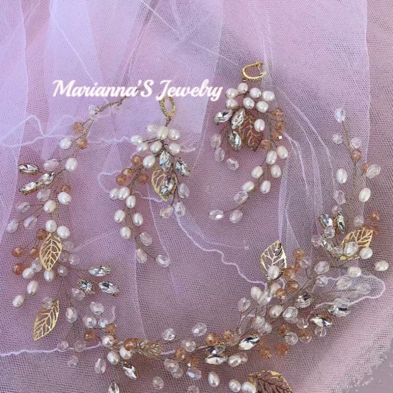 Ніжна гілочка для зачіски,виплетена із натуральних річкових перлин,кришталевих намистин та камінців. Оздоблення золотистими листочками доповнює композицію прикраси. Ідеальний набір під весільну сукню тону айворі (сережки ручної роботи +550 грн).