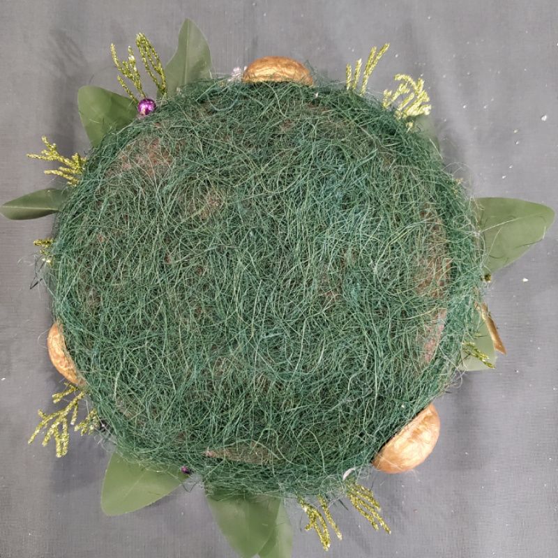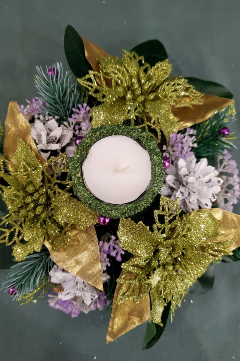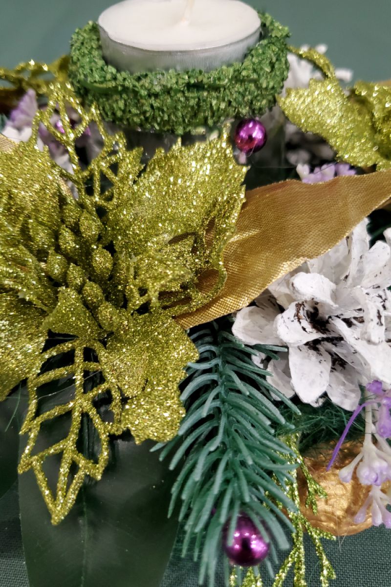 Ікебана на стіл з ємністю для свічки та золотими новорічними квітами, шишками, гілками ялинки, дрібними квітами, листочками, гілками прикрасить ваш будинок, додасть святкового настрою. Основа зроблена з каркасу обгорнута тканиною, щоб не дряпала стіл. Міцно все закріплено, у мішку для зберігання. Буде служити довго. Чудовий подарунок.