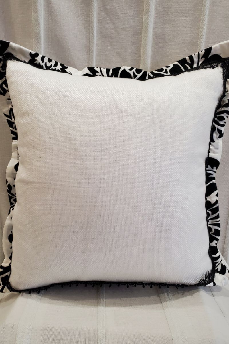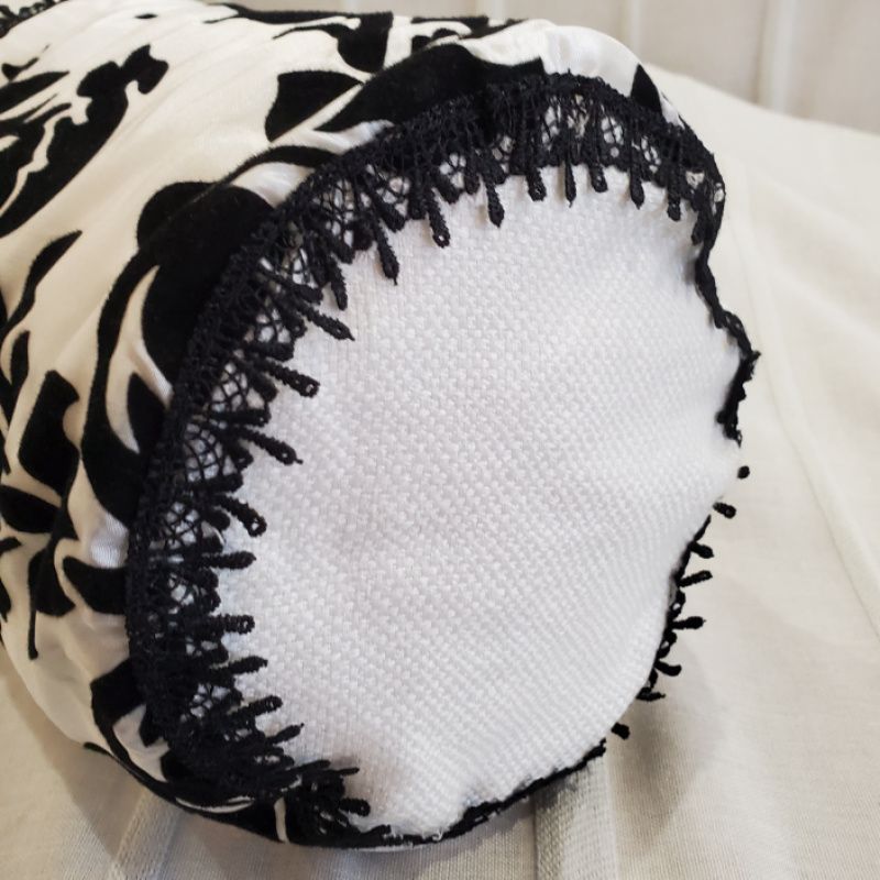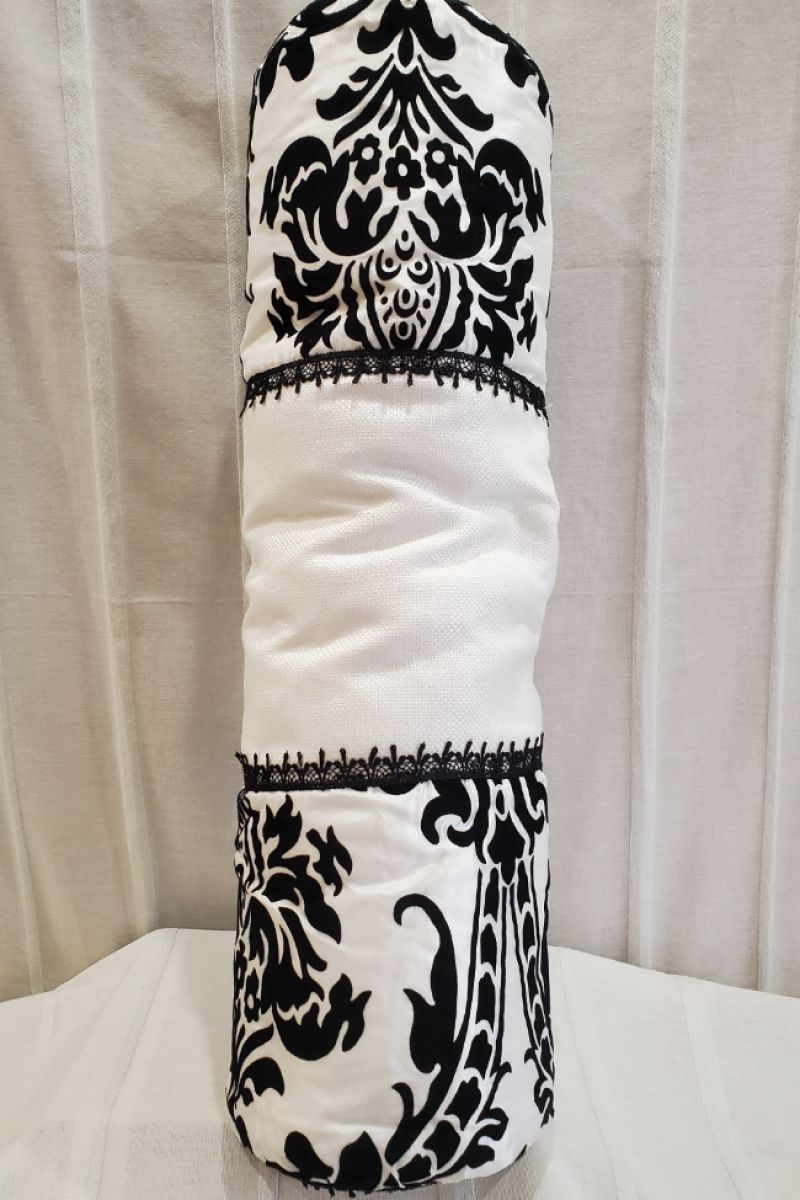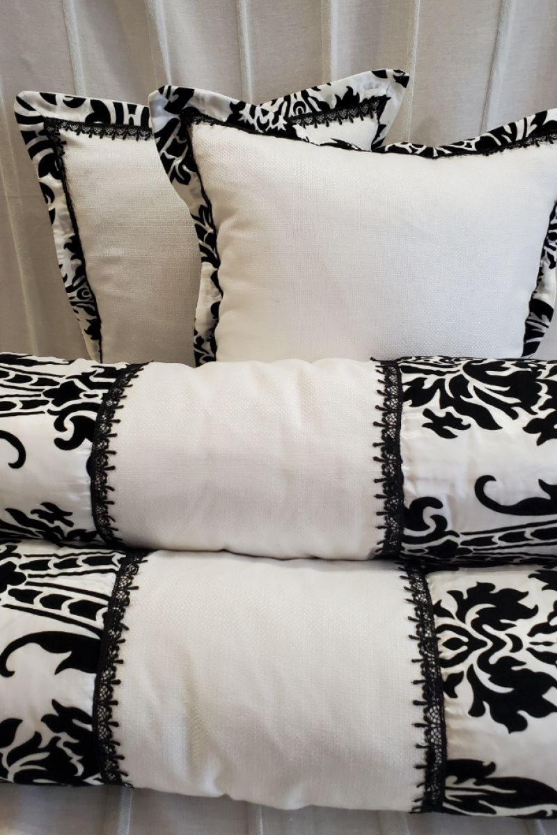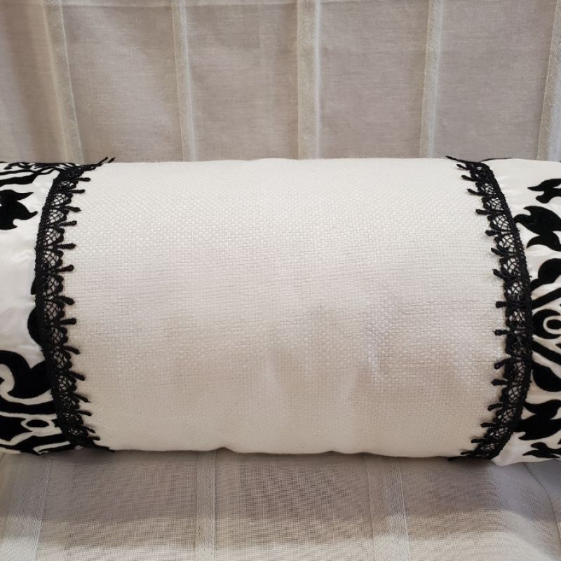 Гарний комплект 2 подушки (розмір наволочки 45х45, розмір подушок 40х40), валики довжина 65см і діаметр 15-17 см для дивану у вітальню, для ліжка в спальні, для подарунка.... Чорно біла тканина, тканина біла льон , Штучний штучний шовк з набивним малюнком, у всіх предметах таємна блискавка, тобто наволочки знімні, довжина блискавки 40 см. Оздоблення тканинні мережива. Колір виробів підійде до будь-якої кольорової гами вашого будинку. Доставка проста- за допомогою пилососа подушки та валики зменшуються у розмірі.