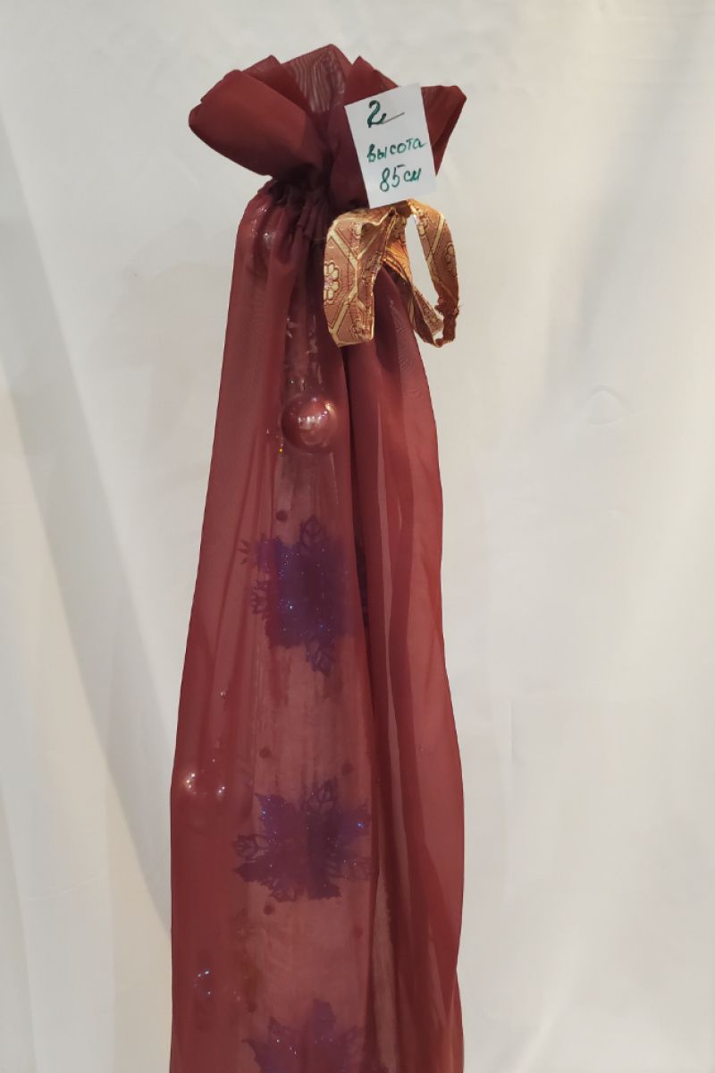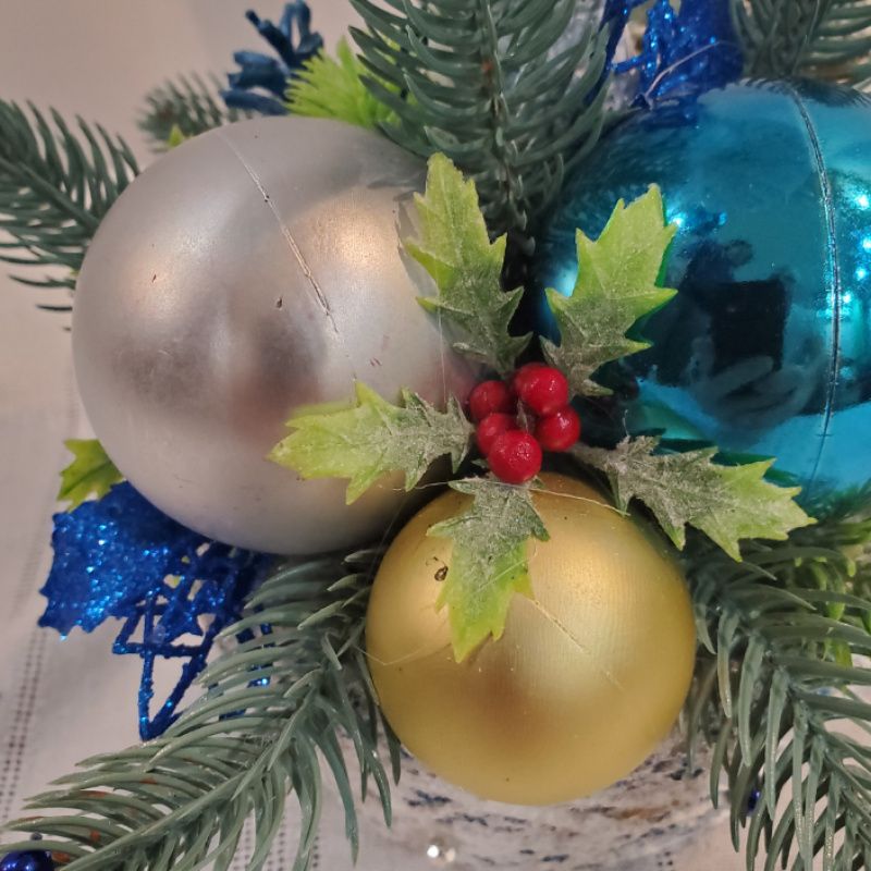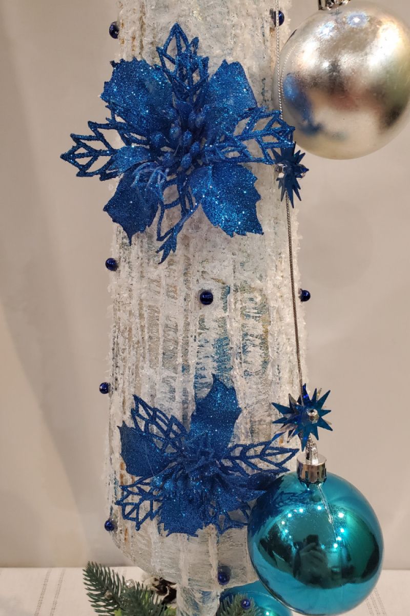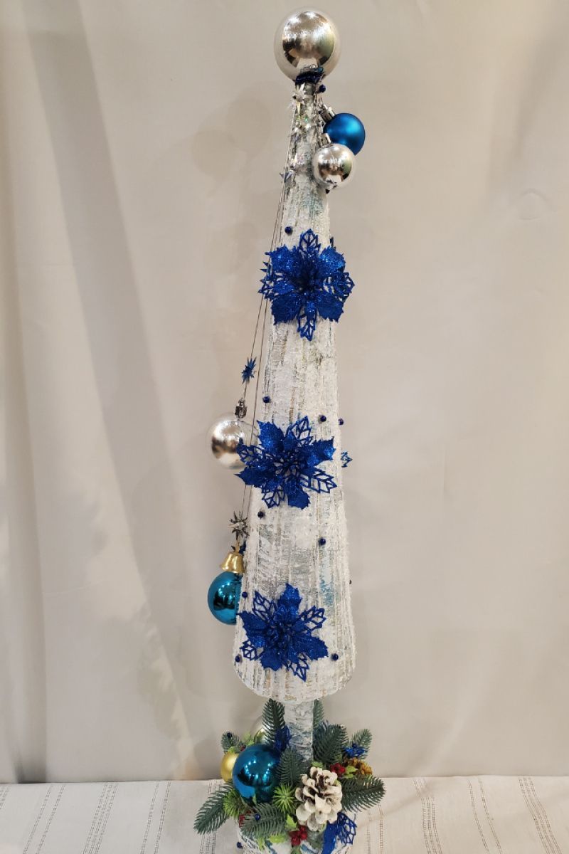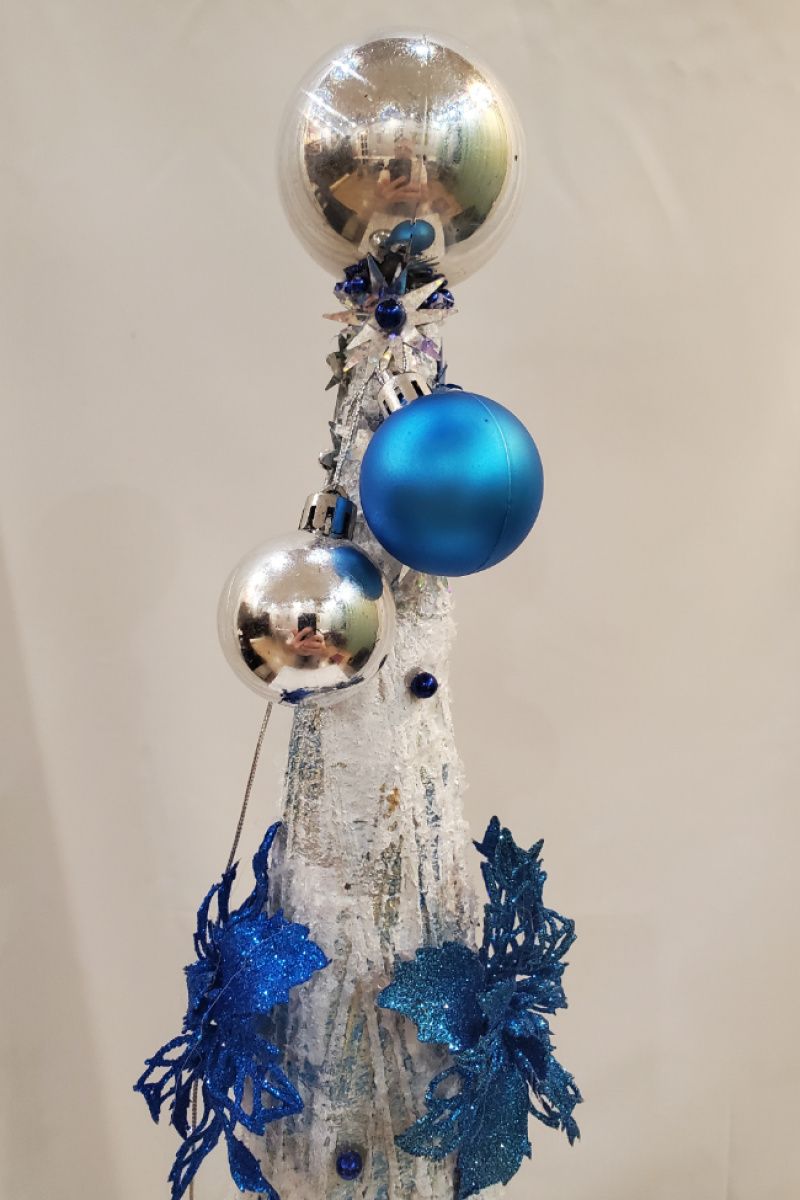 Новорічна ялинка велика із срібно-синьому кольорі з прикрасами; кулями, квітами, низ ялинки прикрашений кулями, шишками, гілками ялинки. Ялинка зроблена з картону, тканини пофарбована фарбами кілька тонів, тонована фарбами., не боїться вологи. У святковому червоному мішку для зберігання.