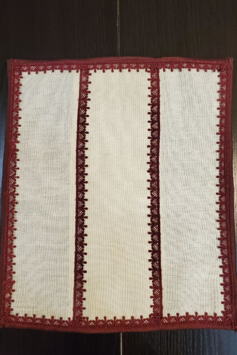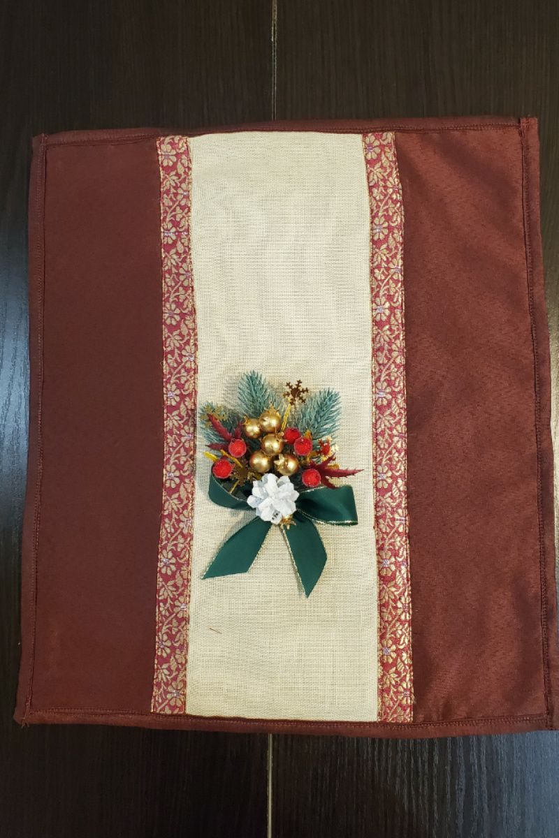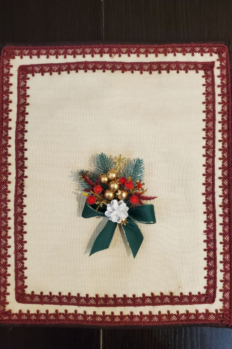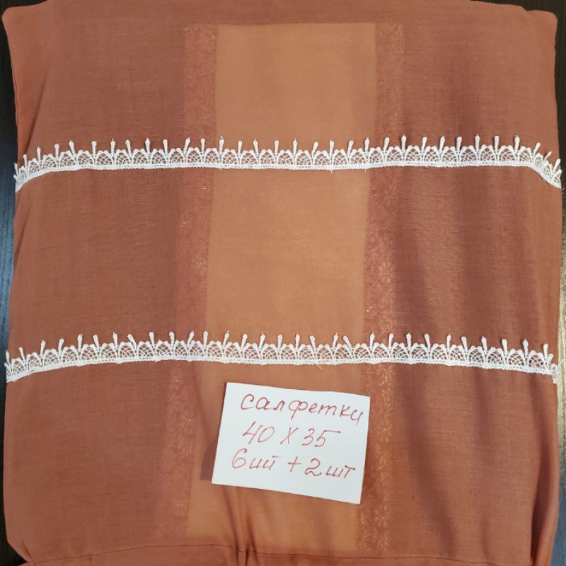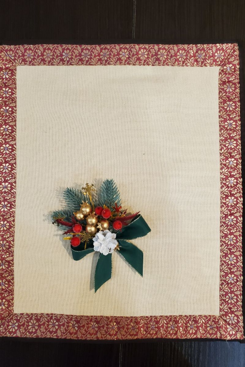 Святкові серветки двосторонні, з одного боку мереживні, з іншого з новорічною святковою тасьмою розмір 40*35 6 штук + 2 серветки на середину столу мереживні 40*35, Середина серветок льон. Можна додатково придбати скатертину, прикрасу для серветки новорічні (показані на малюнку з бантом).