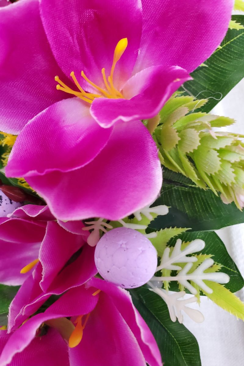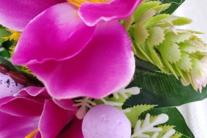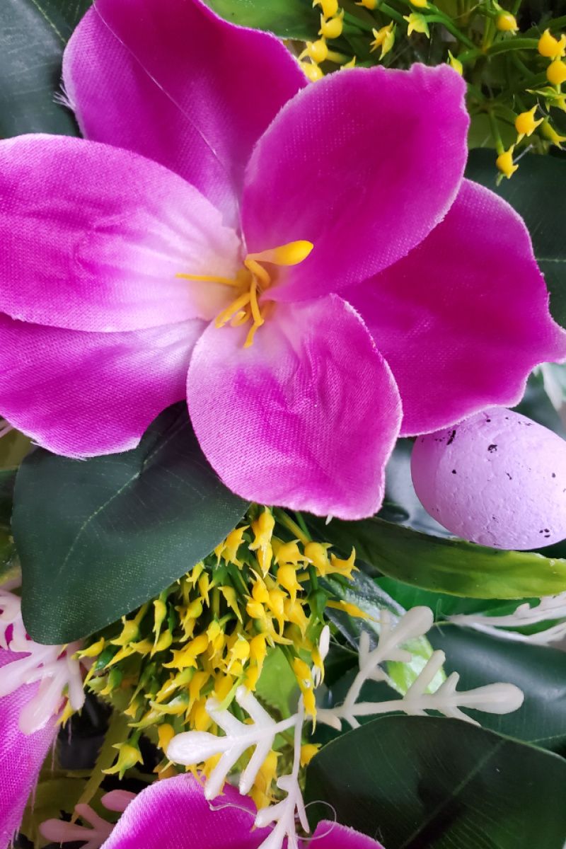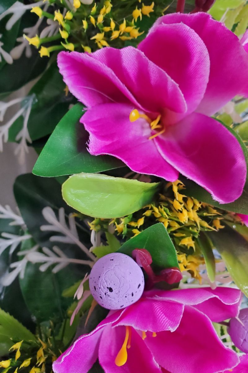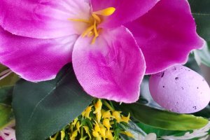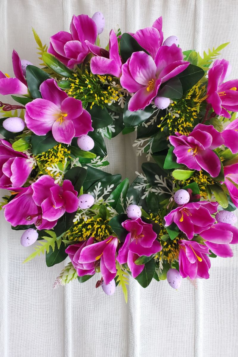 Великдень прекрасне та дуже світле свято. Прикрашати будинок до нього можна на свій розсуд і смак, можна змішувати різні стилі та напрямки. Головне, щоб у будинку обов'язково були присутні атрибути Свята — великодні вінки, композиції з весняними квітами, зеленню, великоднє дерево, прикрашене фарбованими яйцями, свічник зі свічкою. Це свято завжди святкується навесні, тому це символ воскресіння та нового життя! Вінок із бузковими орхідеями, діаметр 35см, прикрашений зеленню, дрібними квітами, яйцями – можна повісити на двері, стінку або прикрасити стіл, поставивши всередину свічку (не забудьте про техніку безпеки – краще у скляну ємність). М'яка основа - не подряпає поверхню і довговічніша (ніж основа з лози - пересихає).