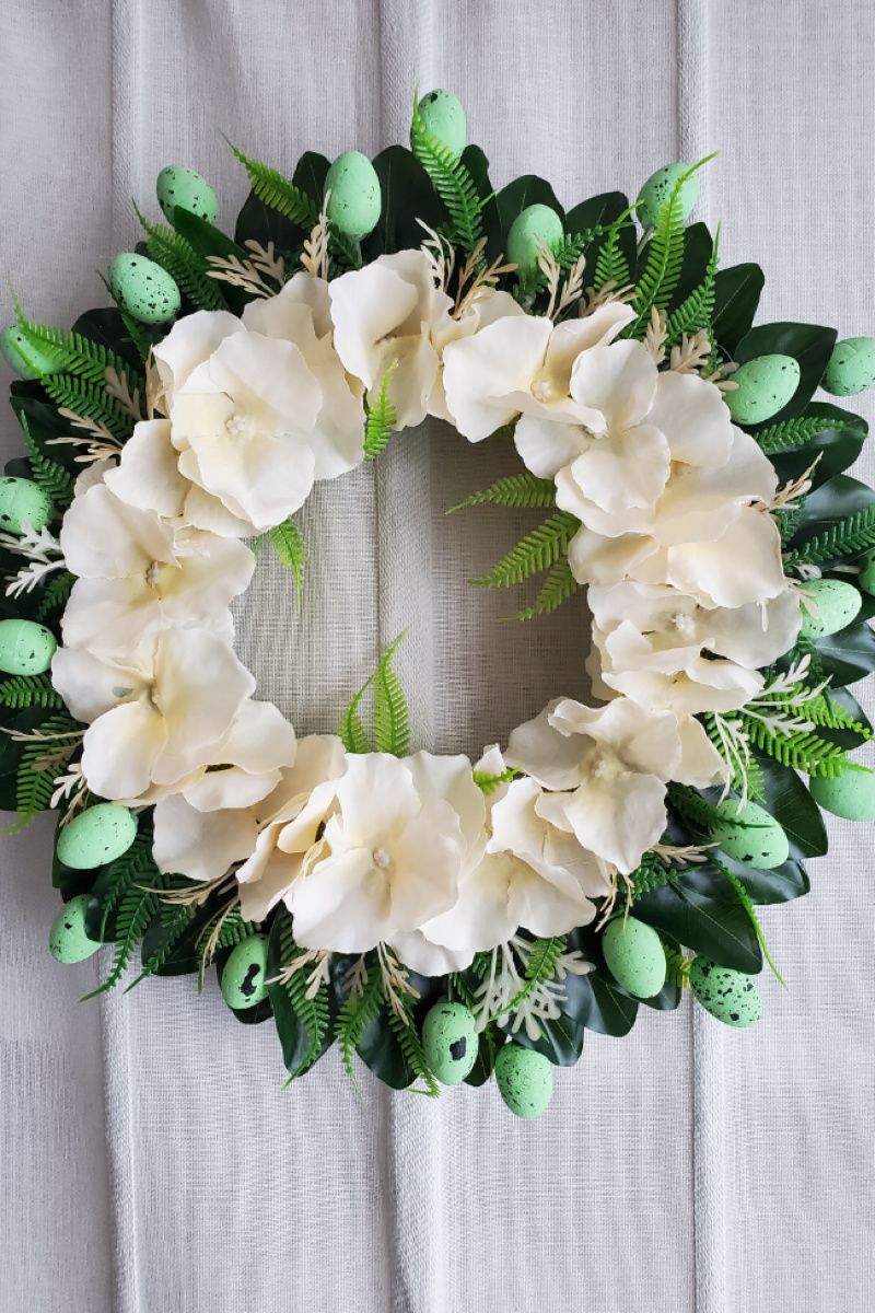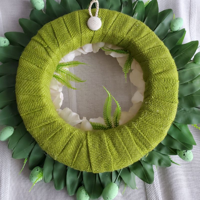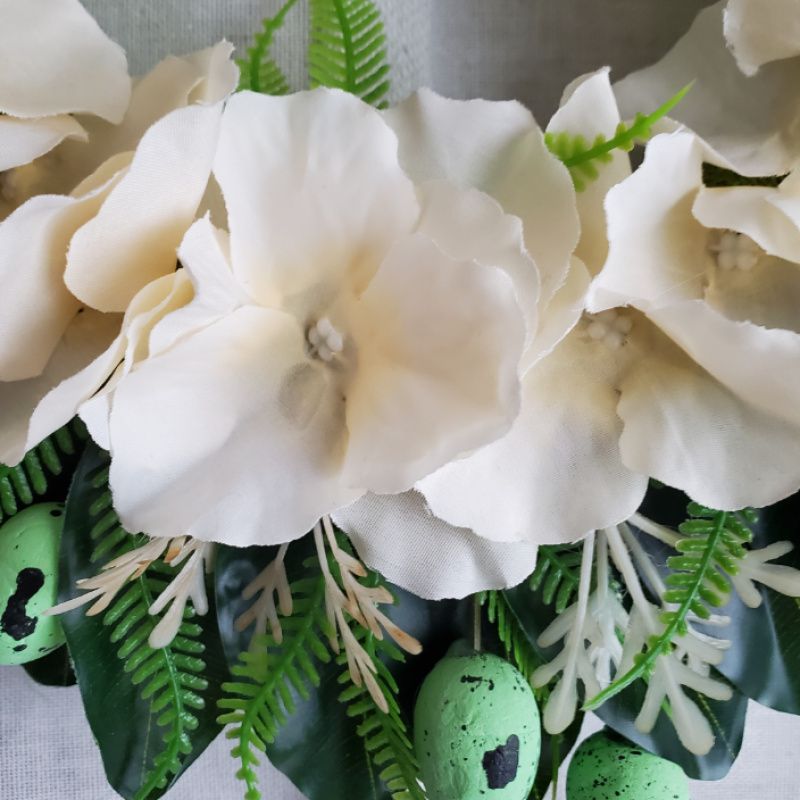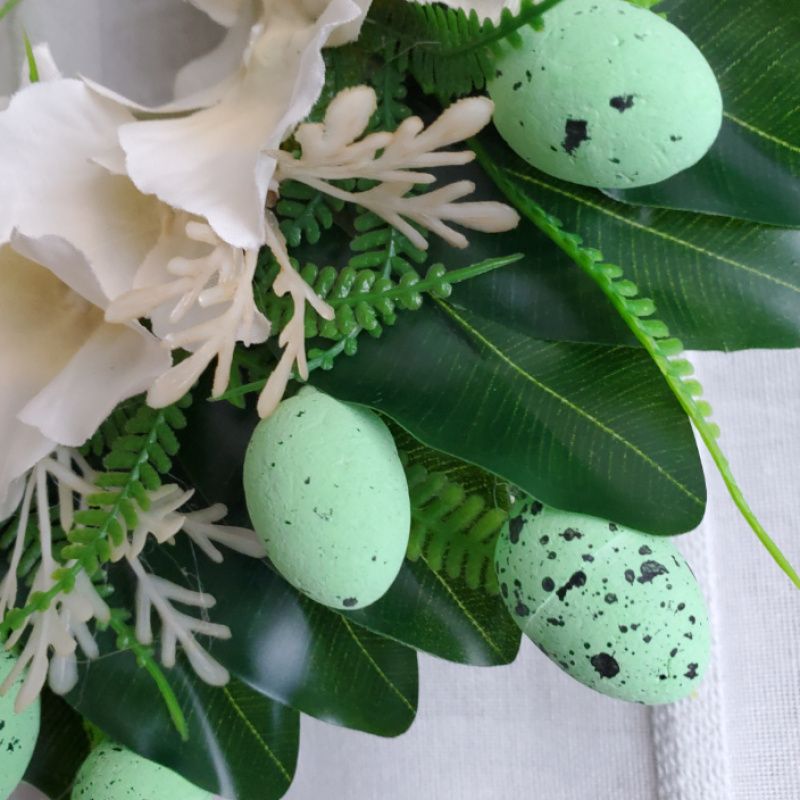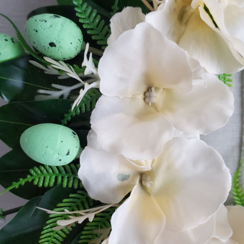 Великдень прекрасне та дуже світле свято. Прикрашати будинок до нього можна на свій розсуд і смак, можна змішувати різні стилі та напрямки. Головне, щоб у будинку обов'язково були присутні атрибути Свята — великодні вінки, композиції з весняними квітами, зеленню, великоднє дерево, прикрашене фарбованими яйцями, свічник зі свічкою. Це свято завжди святкується навесні, тому це символ воскресіння та нового життя! Вінок із біло-зеленими маками діаметр 23 см, прикрашений зеленню, дрібними квітами, яйцями – можна повісити на двері, стінку або прикрасити стіл, поставивши всередину свічку (не забудьте про техніку безпеки – краще у скляну ємність). М'яка основа - не подряпає поверхню і довговічніша (ніж основа з лози - пересихає).