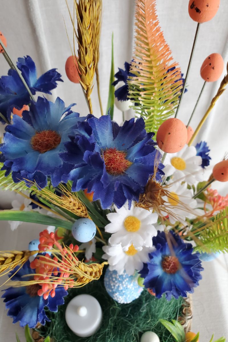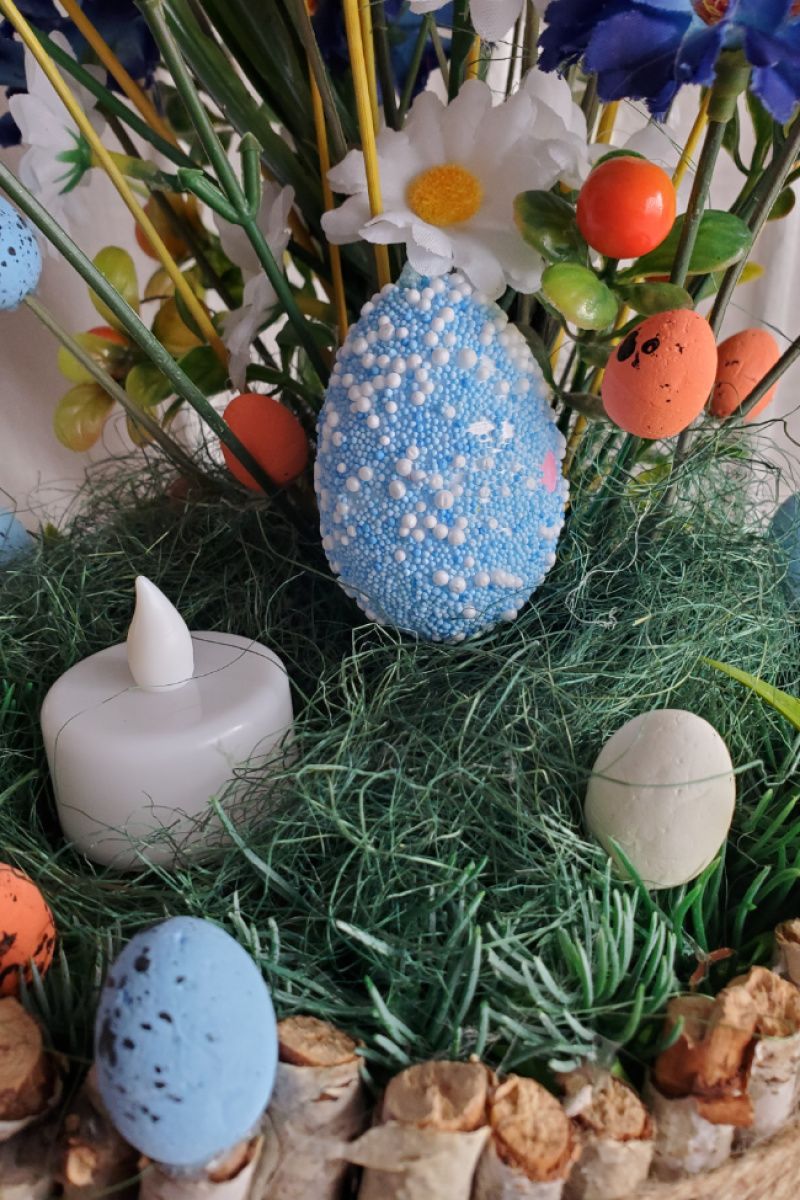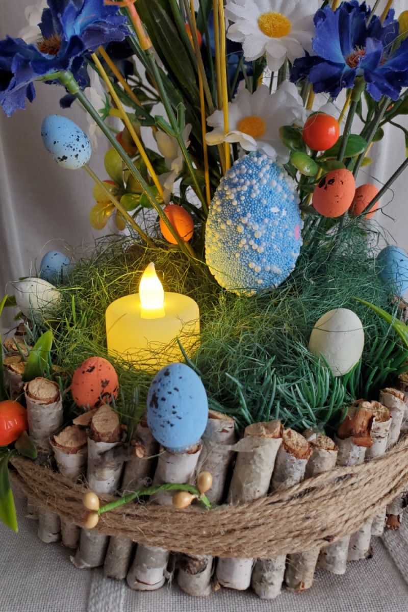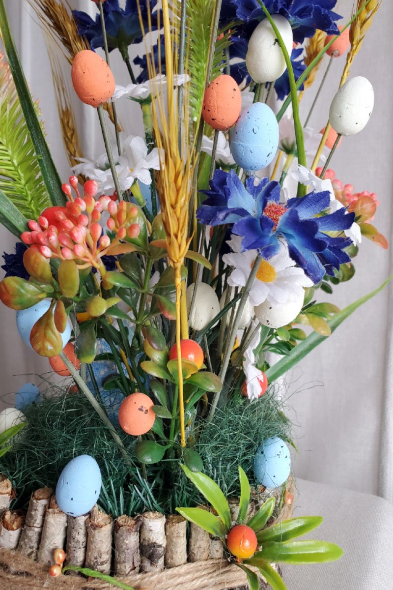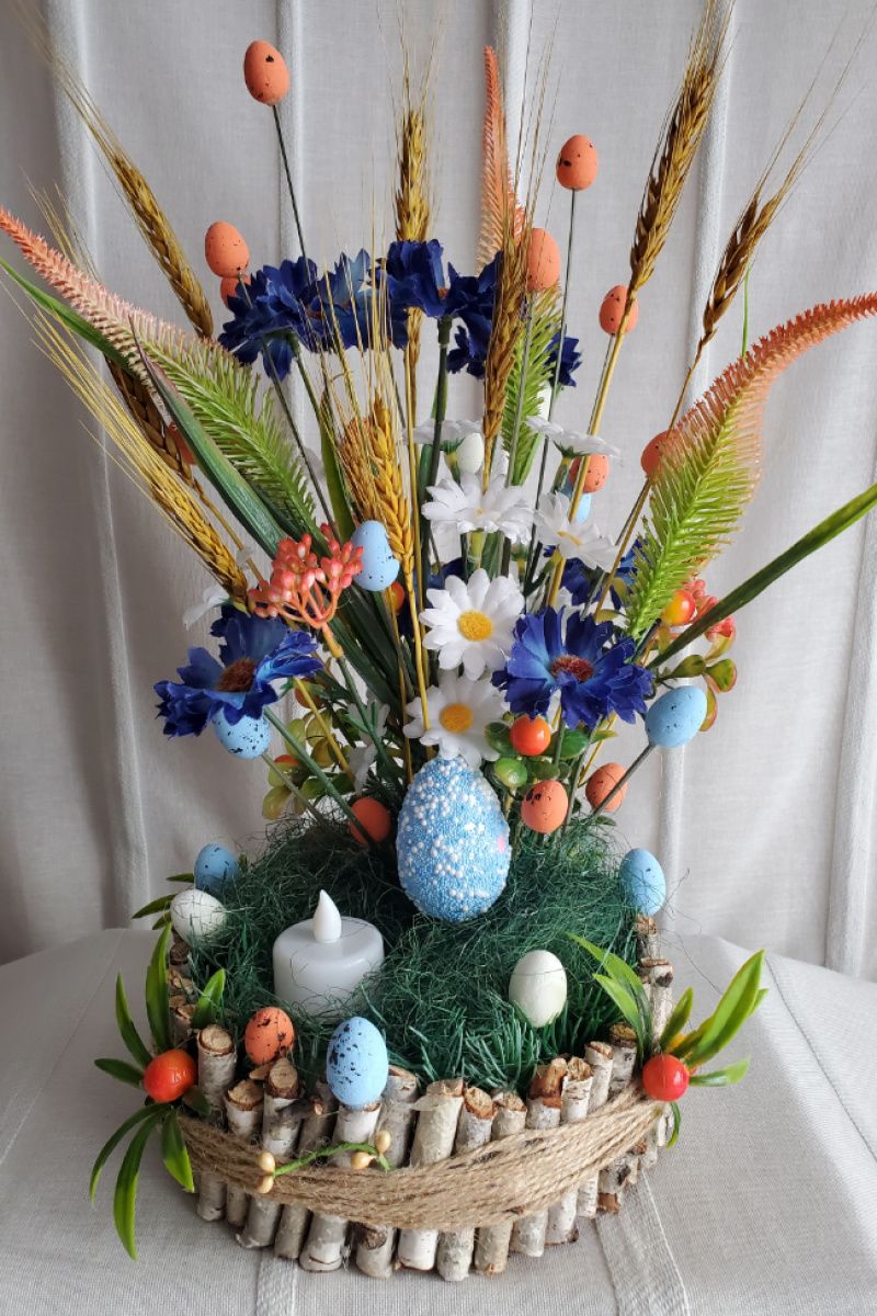 Великдень прекрасне та дуже світле свято. Прикрашати будинок до нього можна на свій розсуд і смак, можна змішувати різні стилі та напрямки. Головне, щоб у будинку обов'язково були присутні атрибути Свята — великодні вінки, композиції з весняними квітами, зеленню, великоднє дерево, прикрашене фарбованими яйцями, свічник зі свічкою. Це свято завжди святкується навесні, тому це символ воскресіння та нового життя! Пасхальна композиція з весняними квітами зеленню (символ весни, відродження), колосками (добробут у будинку), яйцями (символ Великодня), підставка з дерева (довголіття та міцне здоров'я) – прикрасить ваш будинок і подарує надію на все добре.