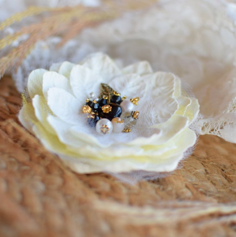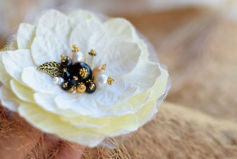 Квітка виготовлена із фоамірану і фатіну розшита різноманітними каміньцями та бісером.