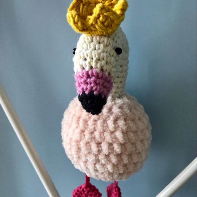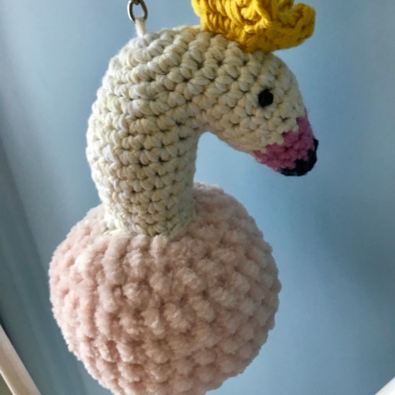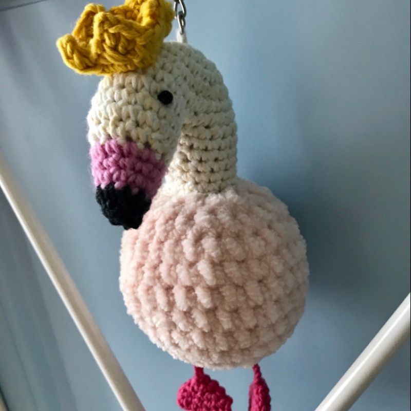 Брелок фламінго з висячими лапками і короною. Пов'язаний в ручну, тіло пов'язане з плюшевою нитки, голова і лапи 100% бавовна.