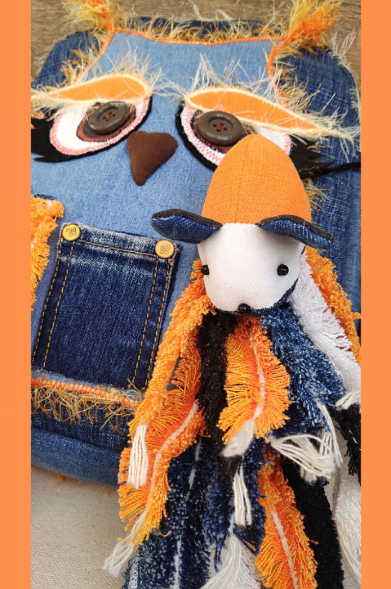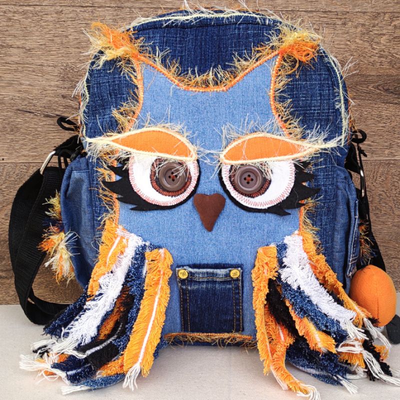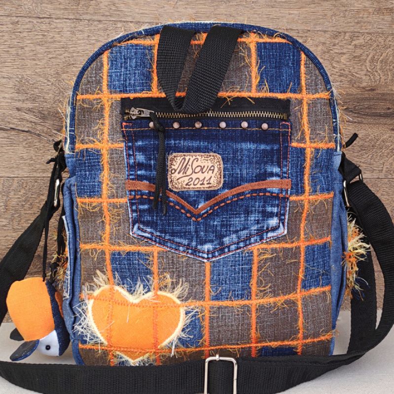 Сумка пошита із джинсів. Аплікація та модель сумки - авторські (MiSovaDenim) Пір'я, маленька передня кишеня та дзьоб пришиті вручну. Зовнішній 4 кишені - одні спереду, дві з боків, одні ззаду. Підклад із плащівки. Внутрішніх дві кишені. Довжина ручки регулюється.
