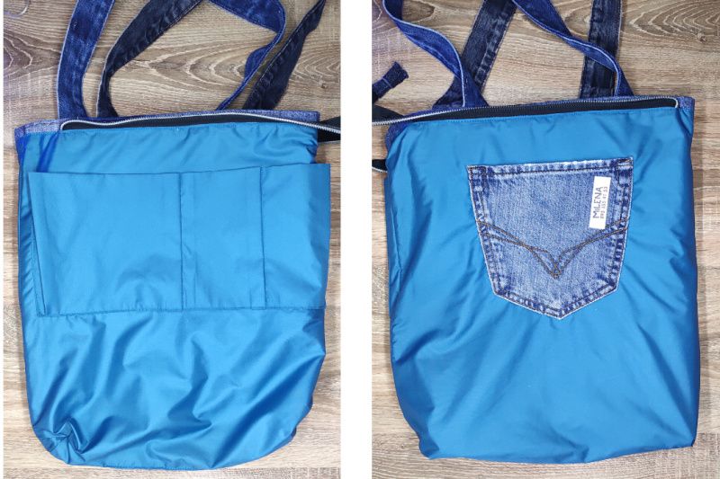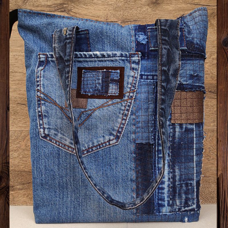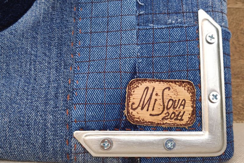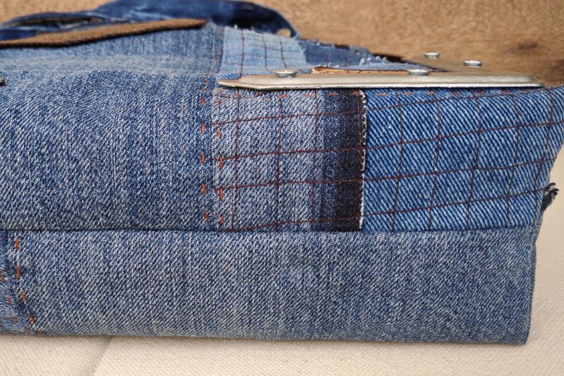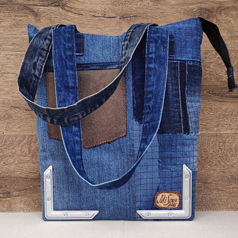 Сумка пошита з джинсів та джинсових та шкіряних клаптів. Декор сумки – металеві будівельні кути, які прикручені на болти та гайки. Кути вкриті срібним лаком. Підклад із плащівки. Кишеня на лицьовій частині сумки із натуральної шкіри. Виріб в єдиному екземплярі. Вага 517 грам