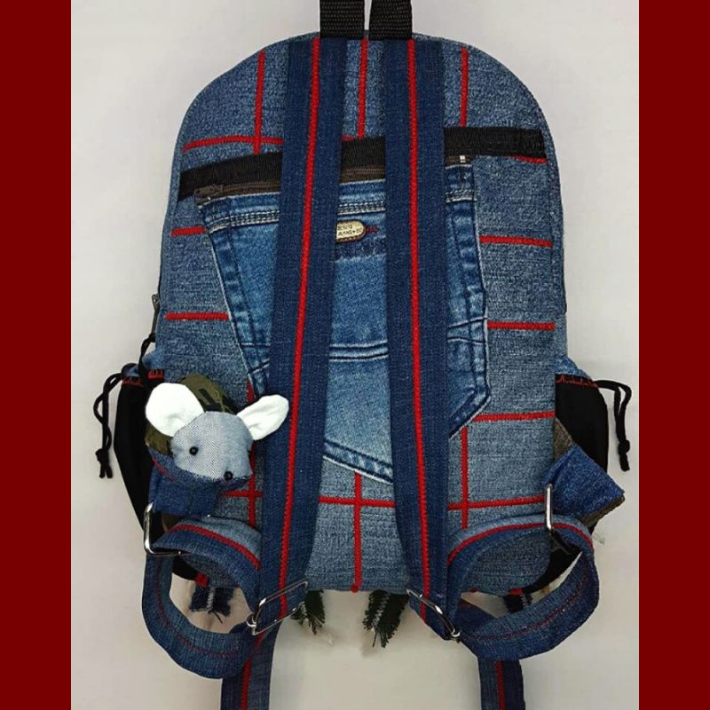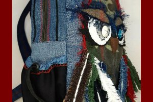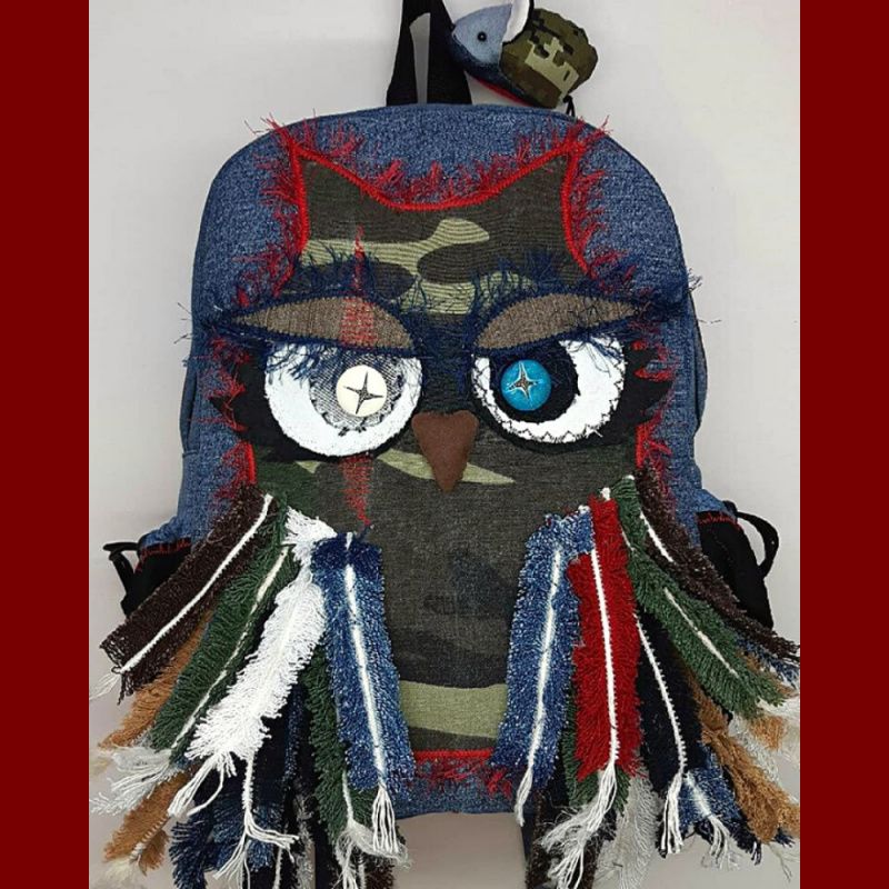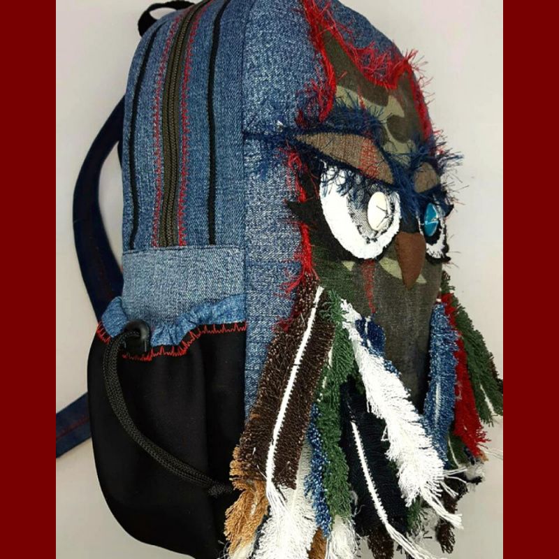 Авторський рюкзак із джинсів. У сови різні очі, бо вона дістала поранення у праве око і він не бачить... Рюкзак в єдиному екземплярі. Підклад із плащівки. Зовнішні три кишені - одні ззаду, дві з боків. Внутрішніх - дві кишені. Без повтору!