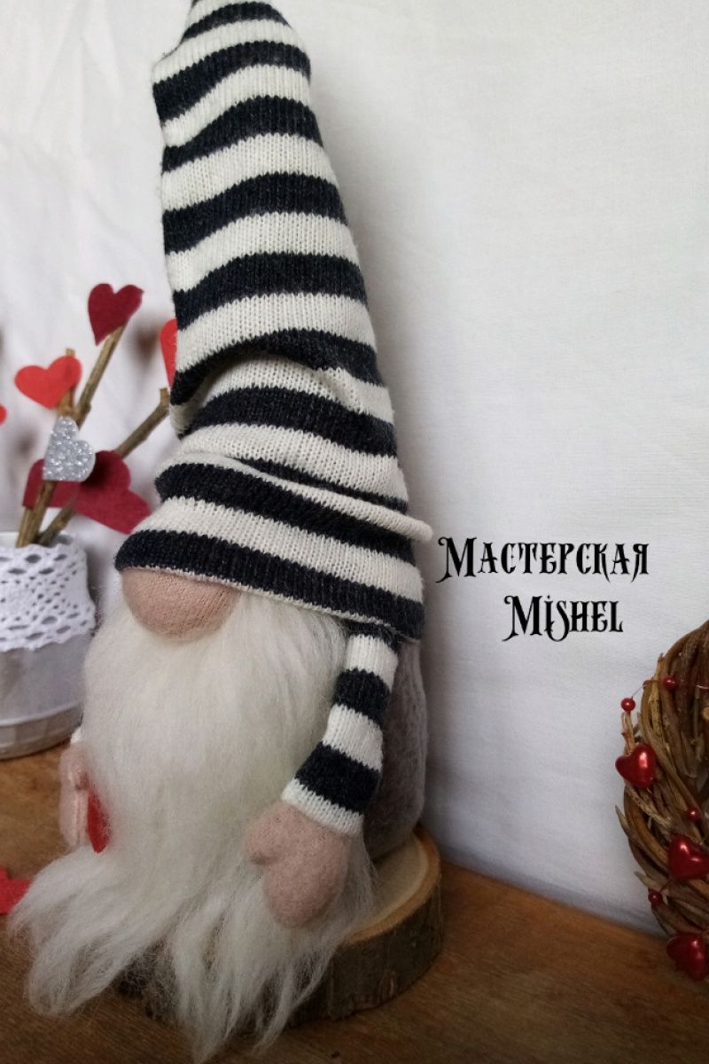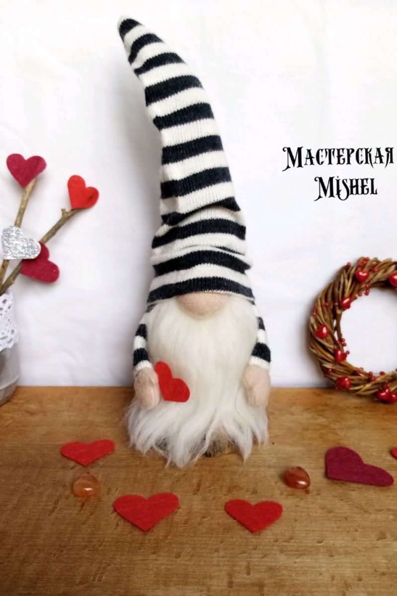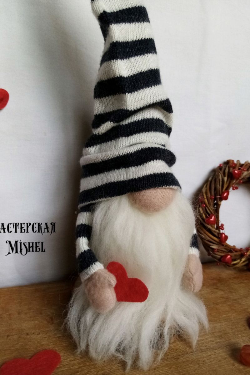 Скандинавський міні гном в смугастій шапочці з тонкої в'язки. Ручки та шапка регулюються у будь-якому положенні. В руках серце. Висота 24 см