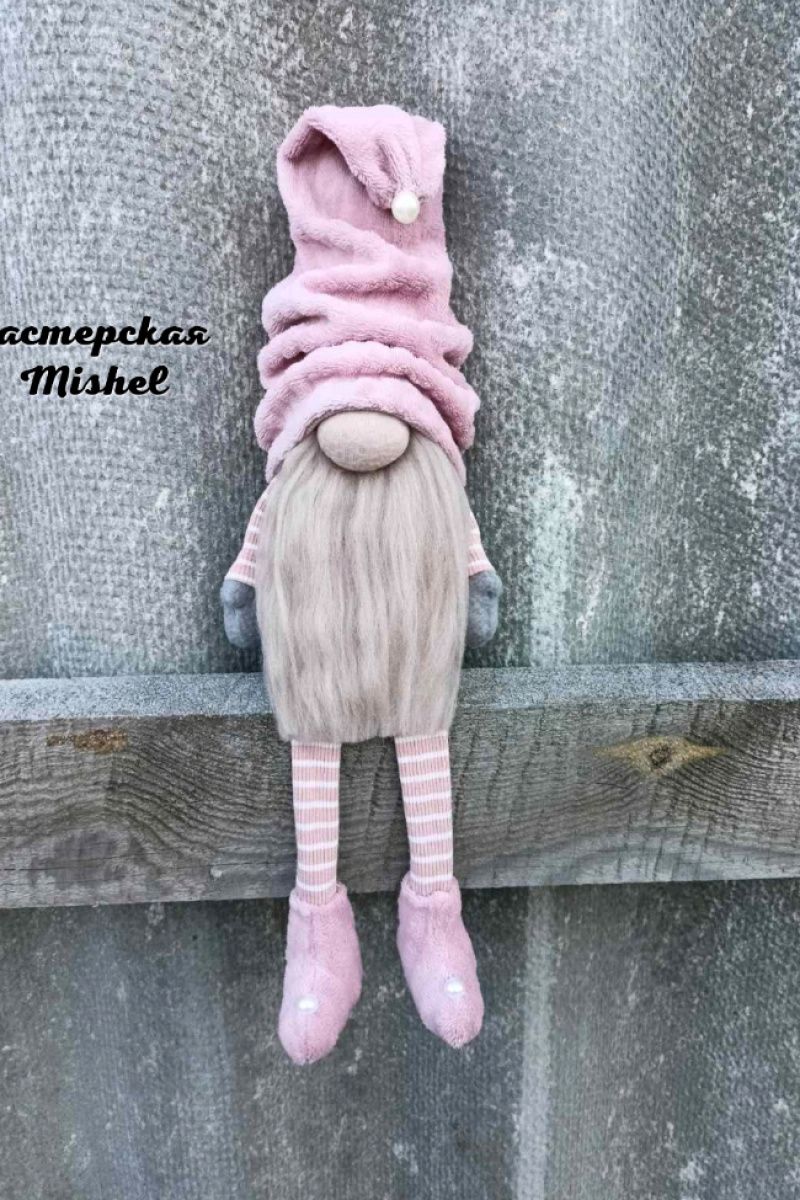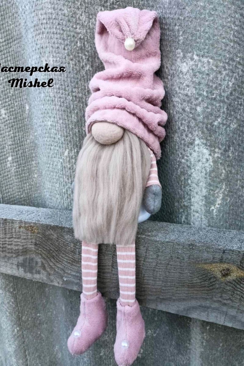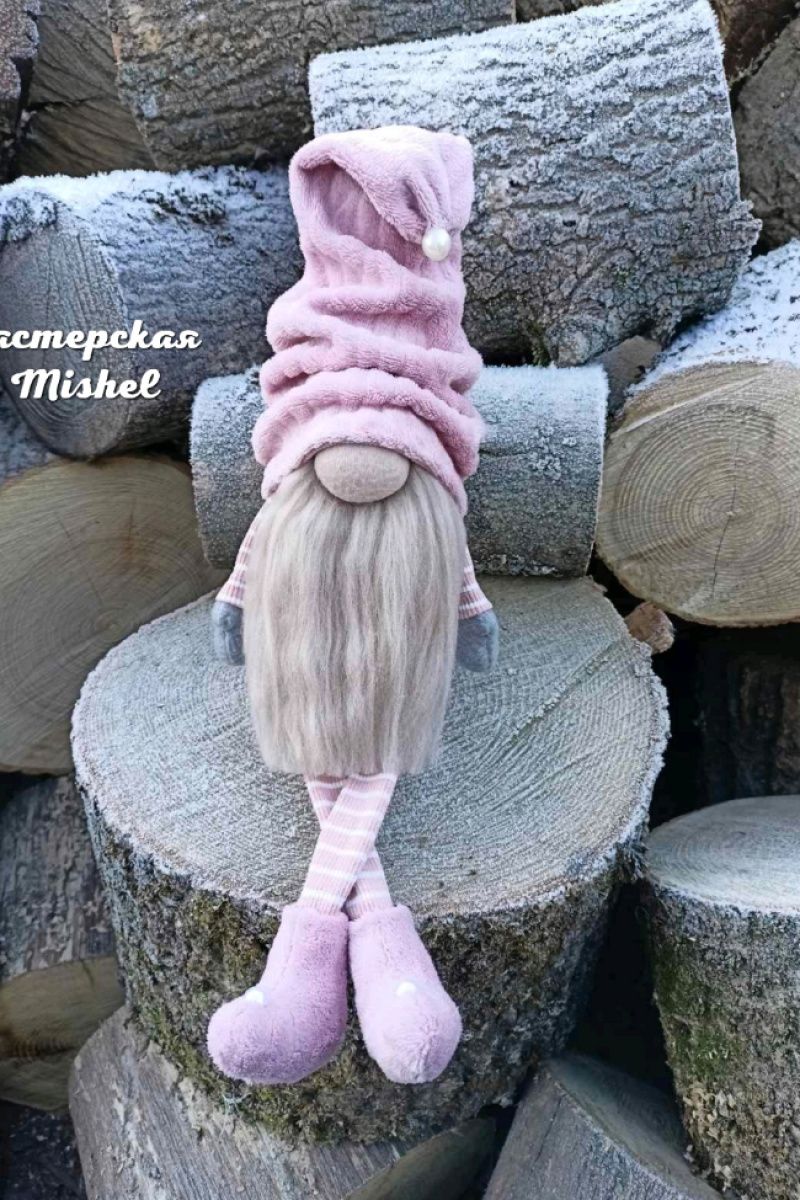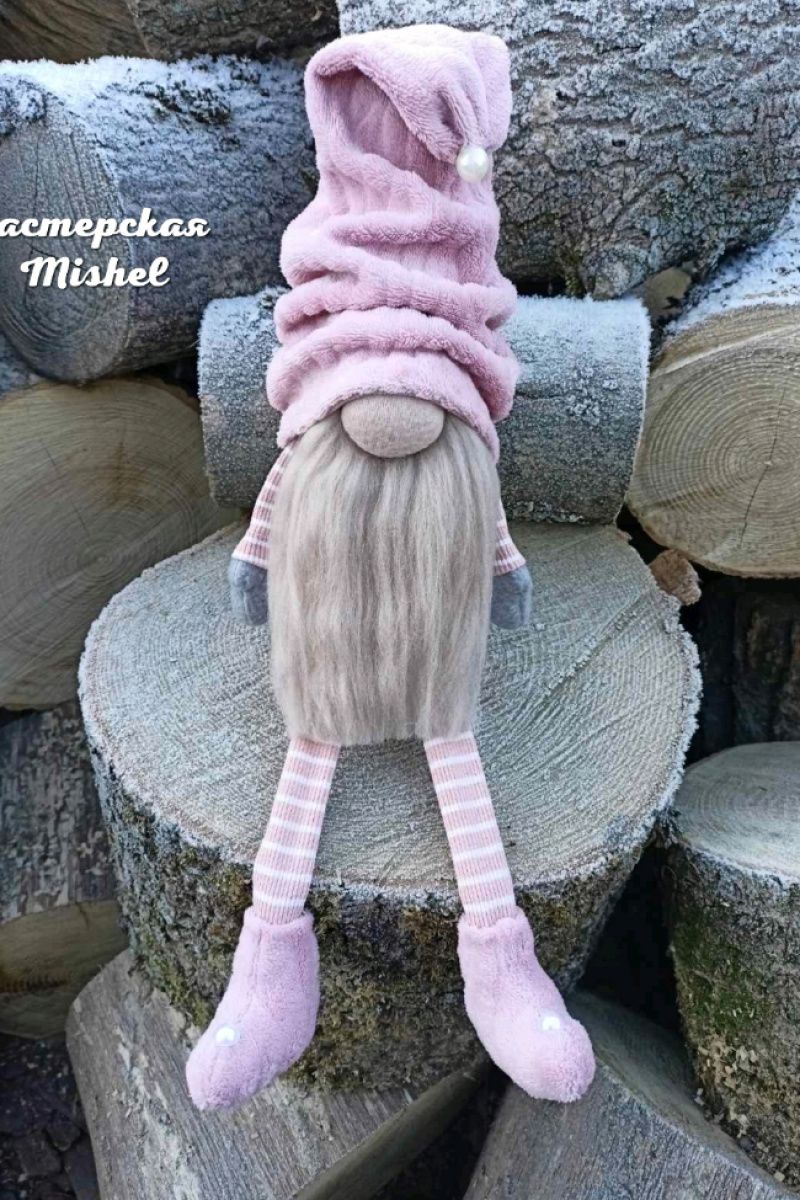 Скандинавський новорічний гном. Шапочка та черевики пошиті з плюшевої тканини, неймовірно м'які та приємні навпомацки. Борода із вовни мериноса, наповнювач синтепон. Висота в сидячому вигляді – 28 см. Довжина ніжок – 17 см.
