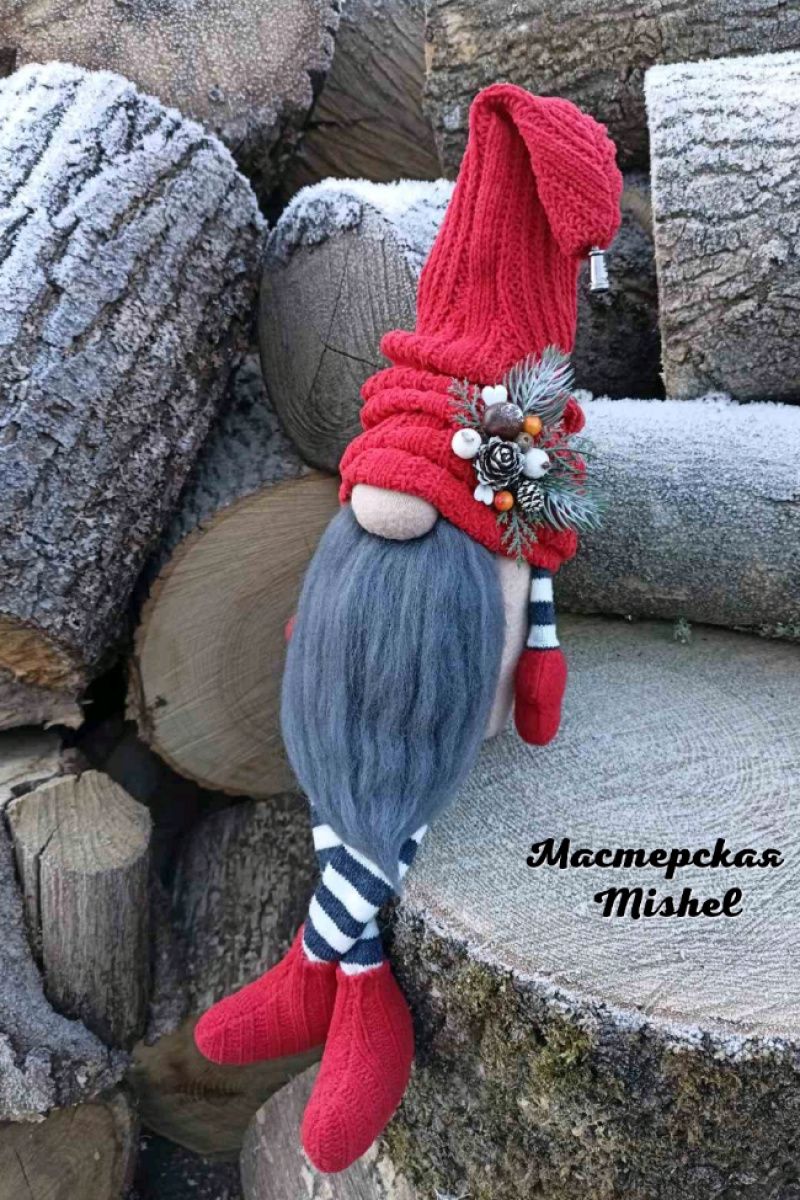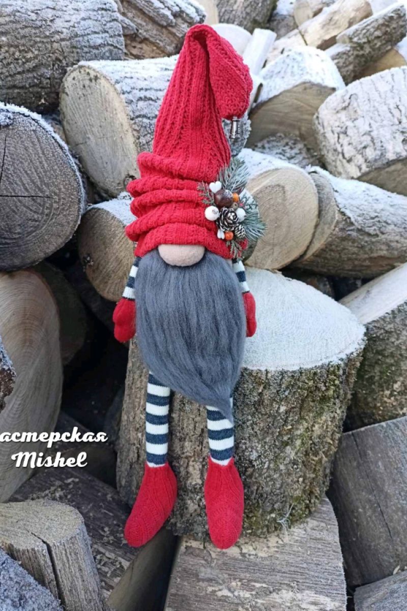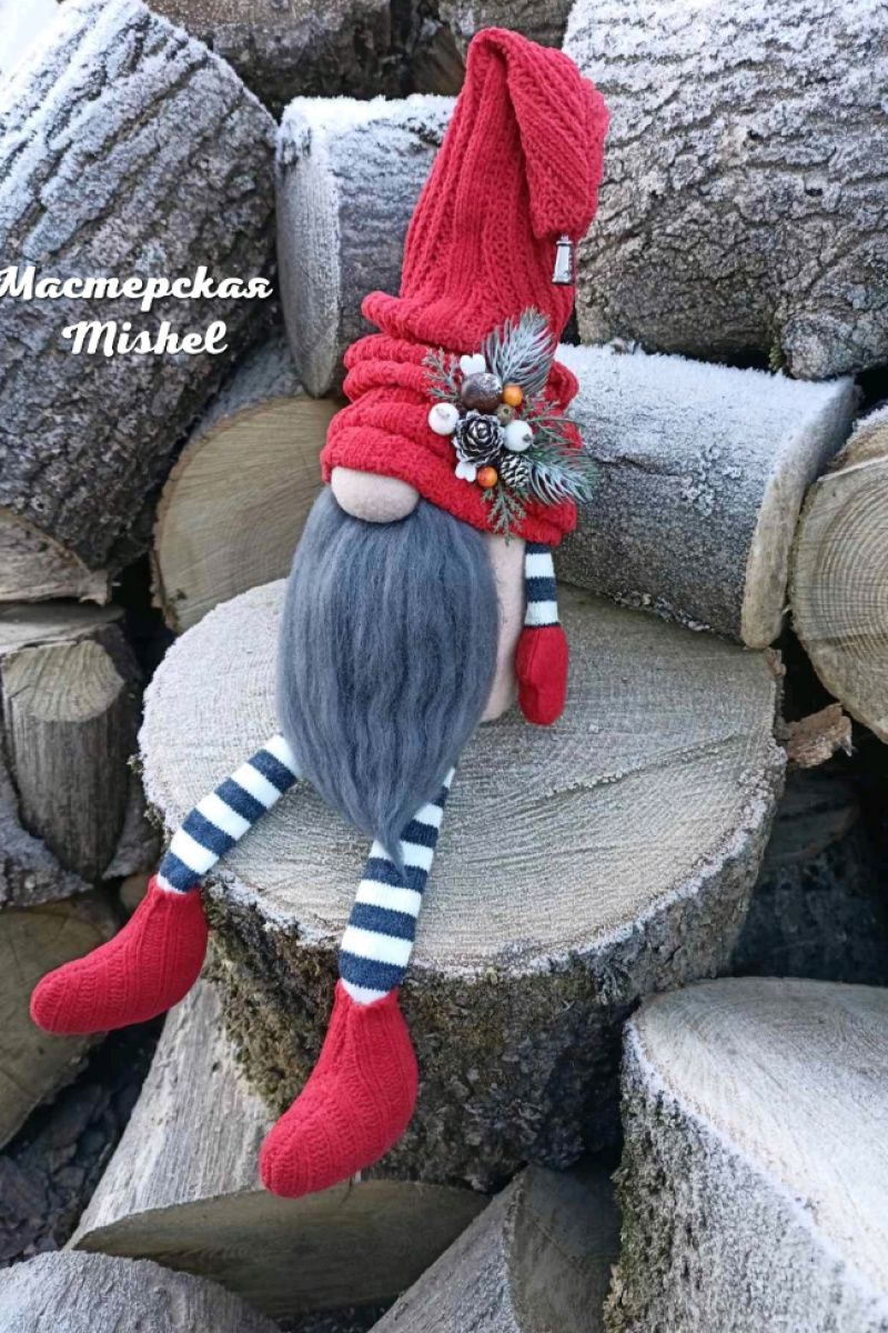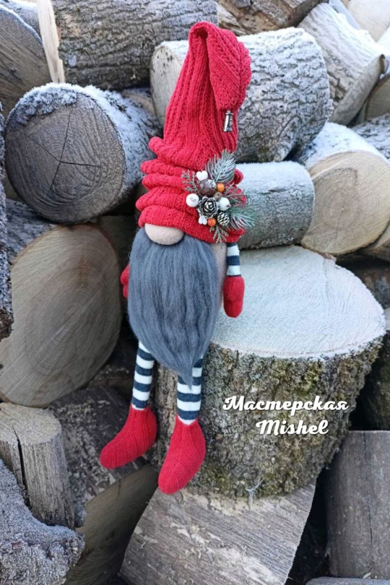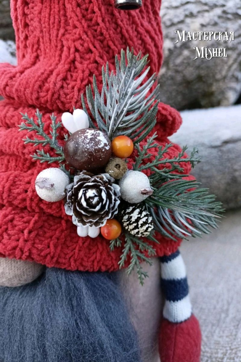 Скандинавський новорічний гном із декором на шапочці. Декор із шишок, позов хвої, ягідок. Повністю ручна робота. Висота в сидячому вигляді – 28 см. Довжина ніжок – 18 см.